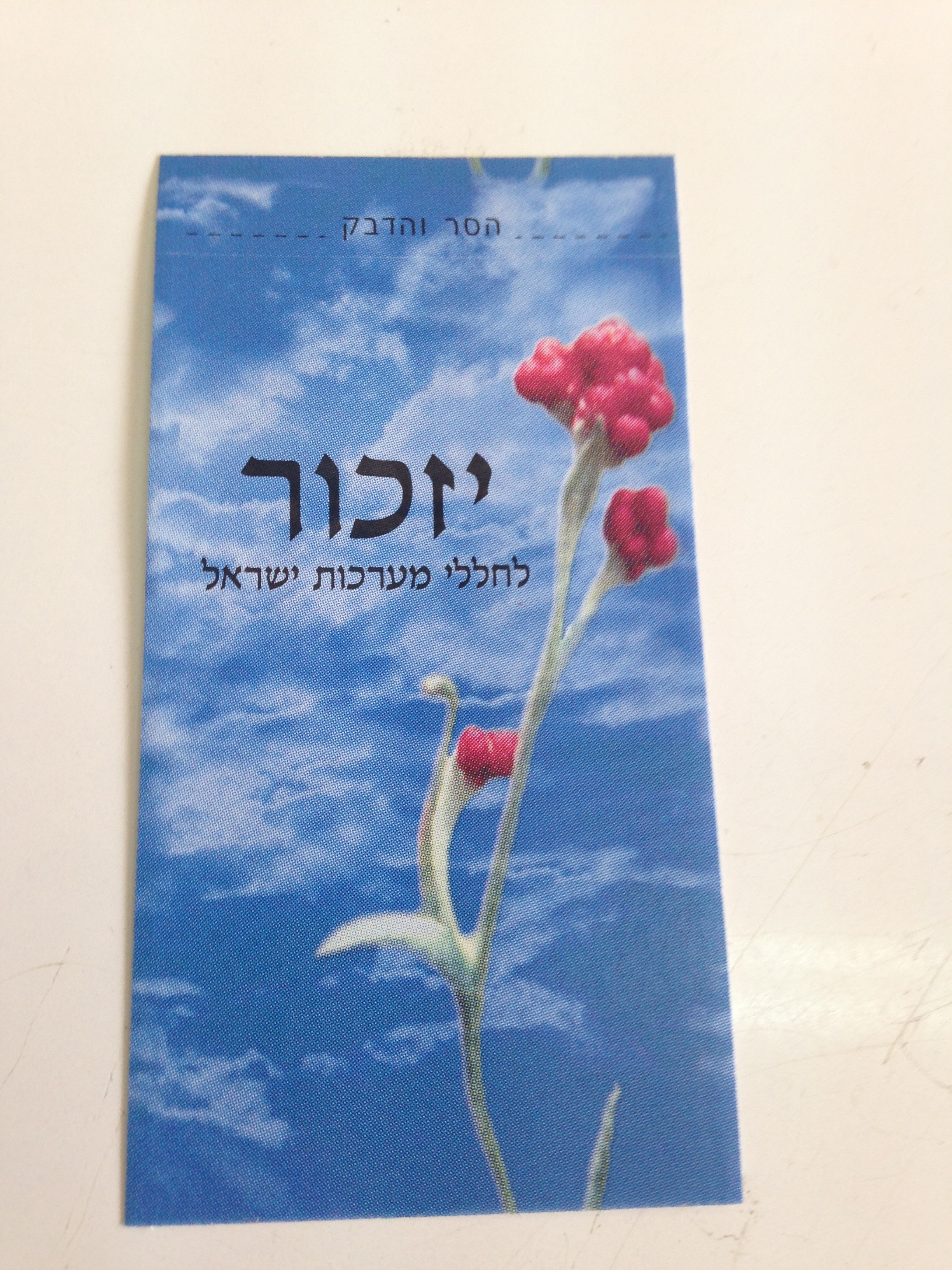 Everyone in the country wears white on Yom HaZikaron. As in America on Memorial Day, all flags are at half mast. Our class took a short walk to the local war memorial – every city and many neighborhoods have one – for a small remembrance of those from Karmi’el who have fallen in the wars. Throughout the country, floral wreaths were sent to the cemeteries and war memorials. The ribboned memorial wreaths came in from schools, synagogues, army units, families and friends of the fallen, the police, the fire department, Magen David Ha Adom Emergency/Red Cross), and local businesses. We lit our large memorial candle and sang the National Anthem, Hatikvah, and as it ended, at 11 am, the national sirens all over the land blasted another loud, long, and somber 2 minute cry. It was if the whole land, now at a stop again – all cars pull to the side, people get out and come out of local shops and schools and businesses – is in mourning for two very long minutes. We listened to poems delivered by mothers and grandmothers of late soldiers, and sang a couple very sad songs, and again chanted the Yizkor prayer before dismissal. The rest of the day is to be spent in silence, and schools and business again close early. This is not a recreational holiday, or a time for play, and everyone respects that.