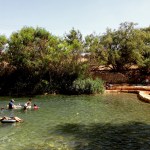 At the bottom of Mt. Gliboa, in the fertile Emek Valley, lies a series of oases, Gan HaShalosha (Three Gardens), also known as Sachne. It is a most beautiful area, now a park, where you can rent a golf cart and drive around to each oasis. The natural pools are fed by the underground springs of the mountains. They are cool and clear, surrounded by date palms and lush vegetation. It is a prime swimming place for heat-weary Israelis. The pools are connected by a series of natural canals, also fed by the springs, and lined on each side with bullrushes. Families go inner-tubing down the streams, and I wanted to stop and “play Baby Moses in the reeds;” however, my teenage son and dear husband had long since outgrown the days of let’s pretend like. It was so much fun swimming in the pools. Families were barbecuing nearby, and the mood was lively and celebratory all-around. I must admit, it gave great opportunity for imagination – all those favorite Biblical characters who must have used this area for bathing and recreation lent itself quite vividly to meditation. All around the area were archaeological sites from pre-canaanite and Canaanite times. What a wonderful area! There’s just so much history here!