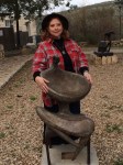 It was a good thing for me that the jewelers and the clothing design shops were all closed. I would have been way too tempted. We visited a couple glass galleries – a stained glass workshop owned by a Russian immigrant who combines ancient Classical motifs into modern stained glass; a glass-blowing gallery which was exquisite. Another favorite part of this special day was meeting up with AnaLia Magen, a very talented sculptor. She led us through her studio, so much fun!!! AnaLia’s grandparents were among the original settlers/pioneers of modern day Tel Aviv. Her latest creations are a series of ceramic towers with sculpted figures adorning the structures. My absolute favorite piece is part of her own private collection and is a tribute to her ancestors and their role in the founding of Israel. She has taken photographs (her grandmother posing with Sigmund Freud; her grandfather as  part of Jabotinsky’s early band of Zionists; her grandfather with Theodore Herzl) and incorporated them into the tower. Each picture includes a hand written note or penciled-in explanation. Typical to Magen’s work are cut-out windows and doors to enable the viewer to see all the detail inside each tower. There are her figures whimsically perched on the ladders and ledges of the sculpture. Very imaginative!! Her incorporation of personal history (as well as the history of Israel) is innovative and fun. She is a most delightful lady, and we can’t wait to visit her again soon.