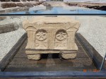 One of my favorite pieces is located in the adjacent room of the sanctuary, in the study hall, lined with low benches. In the center is another piece of liturgical furniture. another large stone, simple, yet very practical. It has a flat top and two diveted lines on each side for placing the two rolls that form the “spines” upon which the Torah parchment was wound. So 2000 years ago, rabbis were laying out and reading the Torah and discussing it together with the congregants – an Ancient Scripture study class. When I first saw this piece five years ago, I was so excited! And now that I live nearby, it is an honor to be able to docent in this place.
