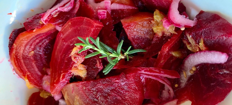Wrap the beets in foil and roast in a 200*C/400*F oven for about 30 minutes or until tender. Allow to cool fully. Remove the skin and any “burned bits.” Slice into a bowl. Squeeze about 1/4 cup orange juice over the beets. Add about 1 teaspoon of the orange zest, and the segmented orange bits (you can also use canned mandarins, which are impossible to find here). Drizzle with about a tablespoon of the olive oil and sprinkle with the slat and pepper. You can add about a teaspoon of fresh rosemary or thyme or just use it as a garnish Both work well in this salad. Top with a scattering of pickled red onions. Serve cold.