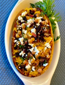 The next recipe served my husband and myself as an entire meal. We were so stuffed, there was no need for anything else, and we still had half a squash leftover. We ate the leftovers as a side dish with the next couple dairy meals. I had bought what I thought was a spaghetti squash at the market, but it didn’t act like one when I roasted it. It was some sort of very rich, flavorful and nutty squash – there are just so many different heirloom varieties of gourds here! The end result was still amazing, but I’m calling for a spaghetti squash in this recipe. Butternut would probably work well, too. Also, the word KHOO-moos (spelled humus, is the whole garbanzo bean, not just the spread).