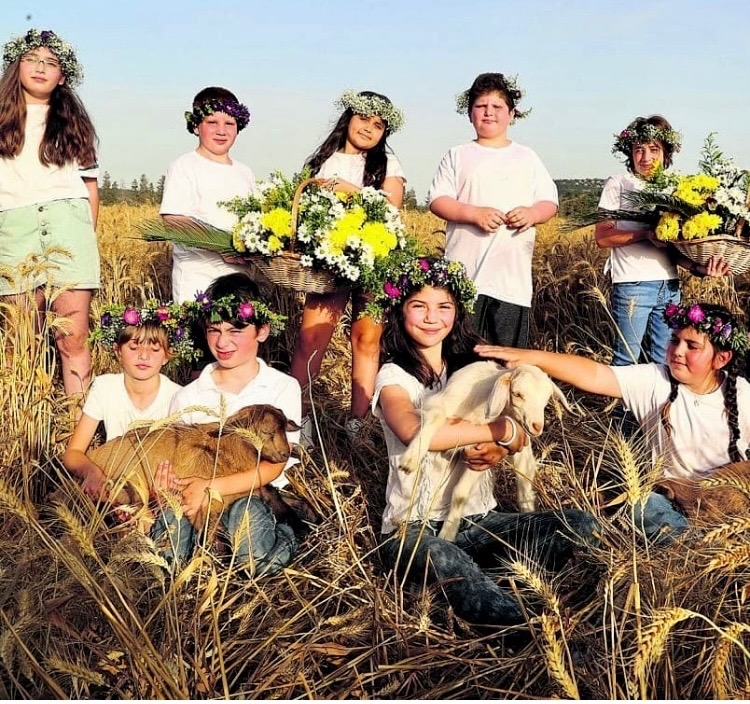 On the farms and kibbutzim, people dress in white and wear floral wreaths on their heads, men and women alike. There is much singing and dancing, and dads dance around holding their little babies high above their heads. There are parades throughout the towns with tractors and floats piled high with fruits and veggies and fresh flowers and with children holding the baby farm animals they helped raise. It has the feeling of a rural American county fair.
