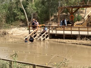 Last month, our good friend, Marc, wanted to visit that spot at the Jordan River – to see how high the water was after two years of heavy winter rains. The Kinneret (Sea of Galilee) was still full and feeding the Jordan, which down near the Dead Sea is usually just a slimy trickle a couple inches deep. This year, it was supposed to be freely flowing and quite deep. I was dying to go because not only was it where Elijah was taken up, but it was also the exact spot where the Children of Israel crossed into the Promised Land of Israel at Gilgal (near Jericho)after their forty year desert wanderings – Joshua 3. Once we got down there, I learned it was also the site where John the Baptist was immersing his disciples – and where he immersed Jesus. Also, it marks the spot where the leprous Syrian general Naaman dipped seven times in the river at the directive of Elisha. He was reticent to do something so simple, but was immediately cured of his disease (2 Kings 5). So it was quite the holy place!!!