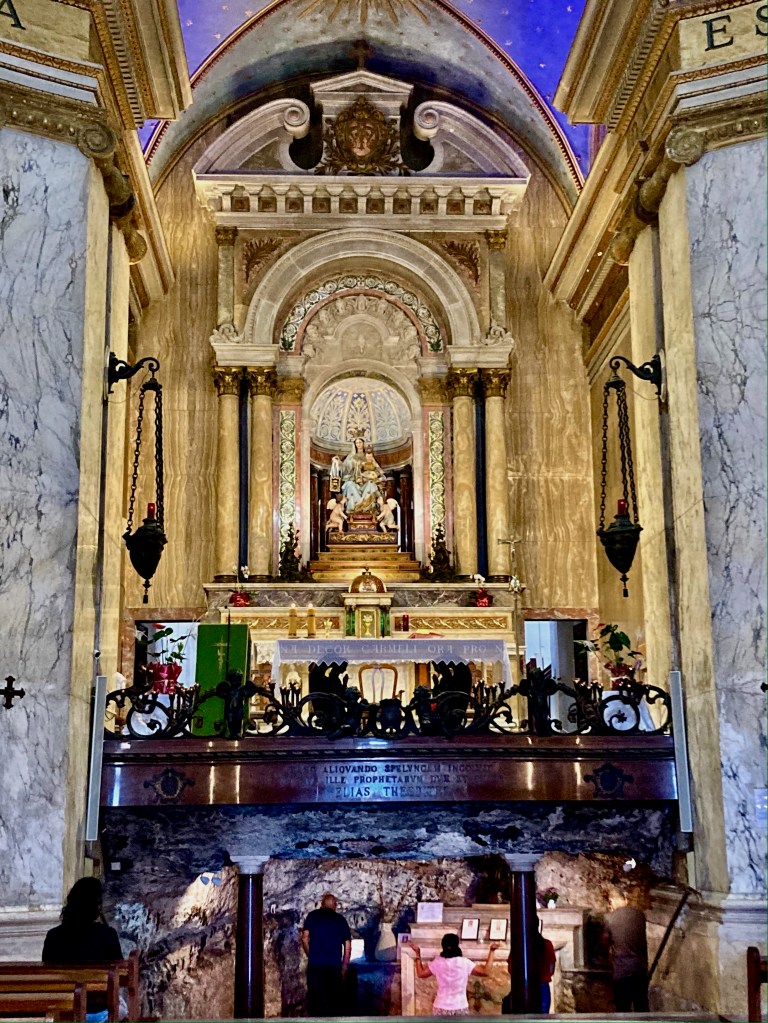 The next Cave of Elijah is a story unto itself. We were equally unprepared for this one. My husband and I heard that there was another cave at the top of the western cliff of Mt Carmel in Haifa, just 140 meters up the hill above the Jewish cave. Literally surrounding the cave is the Roman Catholic Church of Stella Maris, run by the Carmelite order. The Carmelites were founded upon Mount Carmel during the Crusades by hermit monks who lived in caves like the prophet Elijah had done. Many of the monks here were killed by the Muslims in the 1400s, but resettled the mountain in 1631, purchasing the land outright from Emir Jorabay with mediation from the French. They erected the monastery, but were expelled by Al Omar in 1767. Not daunted, the Carmelite monks received patronage from the Turkish Sultan and the French and were allowed to return and expand their building. During Napoleon’s siege of Akko eight miles to the north, the building was converted to a French hospital for the wounded soldiers. In 1821, Abdullah Pasha, the governor of Akko tore down the church, but it was rebuilt in 1836. It became an influential institution to the city of Haifa, attracting a large Arab Christian population. Furthermore, the ‘rediscovery’ of the Holy Land in the late 1880s (Mark Twain) brought more visitors and pilgrims to the area. In 1887, a hostel was built around the cave and church. Many brought their sick who came for the chance the spirit of Elijah would heal them. The large complex of monastery, basilica, lighthouse (which we see from our balcony every night), and surrounding gardens stand to this day.