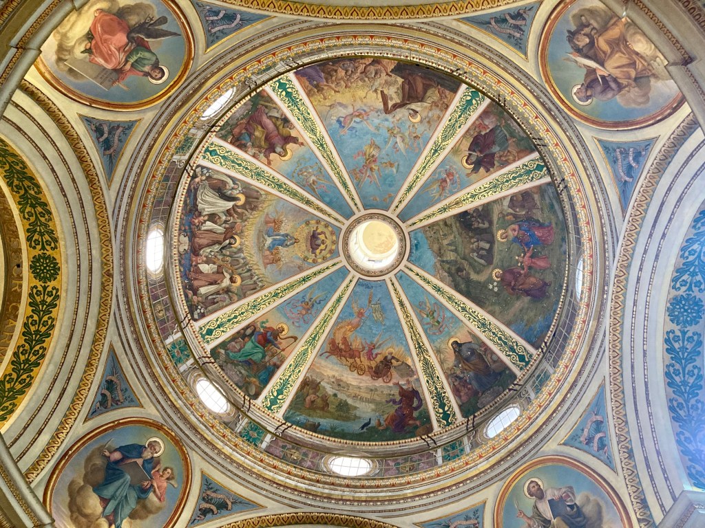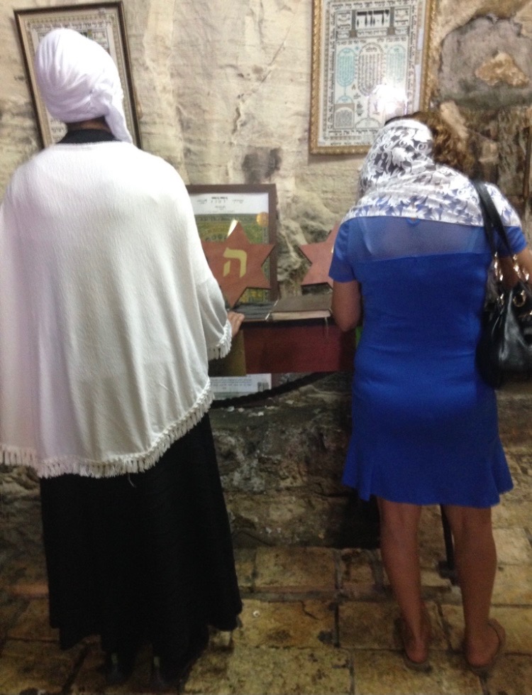 We made it up the mountain to Stella Maris Church just in time for the Mass. The church was reminiscent of many I’d seen in France or Italy. It was astoundingly beautiful, but strikingly different, because the raised altar was built over top of Elijah’s Cave. The walls were marble imported from Italy, as was the mosaic floor. Stained glass panels told the story of Elijah, and overhead was a stunning cupola with frescoed panels depicting Elijah, King David, other prophets, and Mary. Just beyond the pews were three steps down into the grotto, where pilgrims go to pray and light candles, much as in the Jewish cave. Above the altar was a large statue of the Virgin Mary holding baby Jesus. Suspended from her hand is a large scapular. Mary, patroness of the Carmelites, gave this scapular to one of the monks in the 1200s. Many Catholic faithful today wear it. A tiny bit like a talit kattan worn by Jewish men or a mezuzah, the scapular is a prayer placard suspended around the neck by cords or fringes. It rests over the heart and between the scapula bones at the back. Of all the Elijah caves we visited, this was certainly the most impressive.
