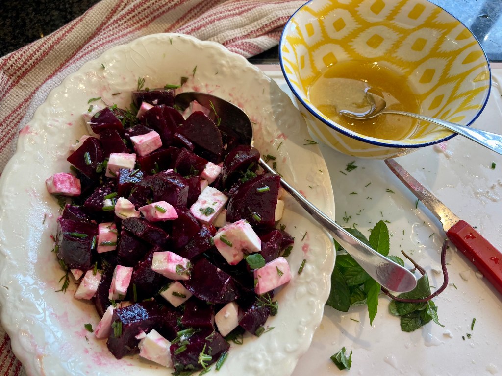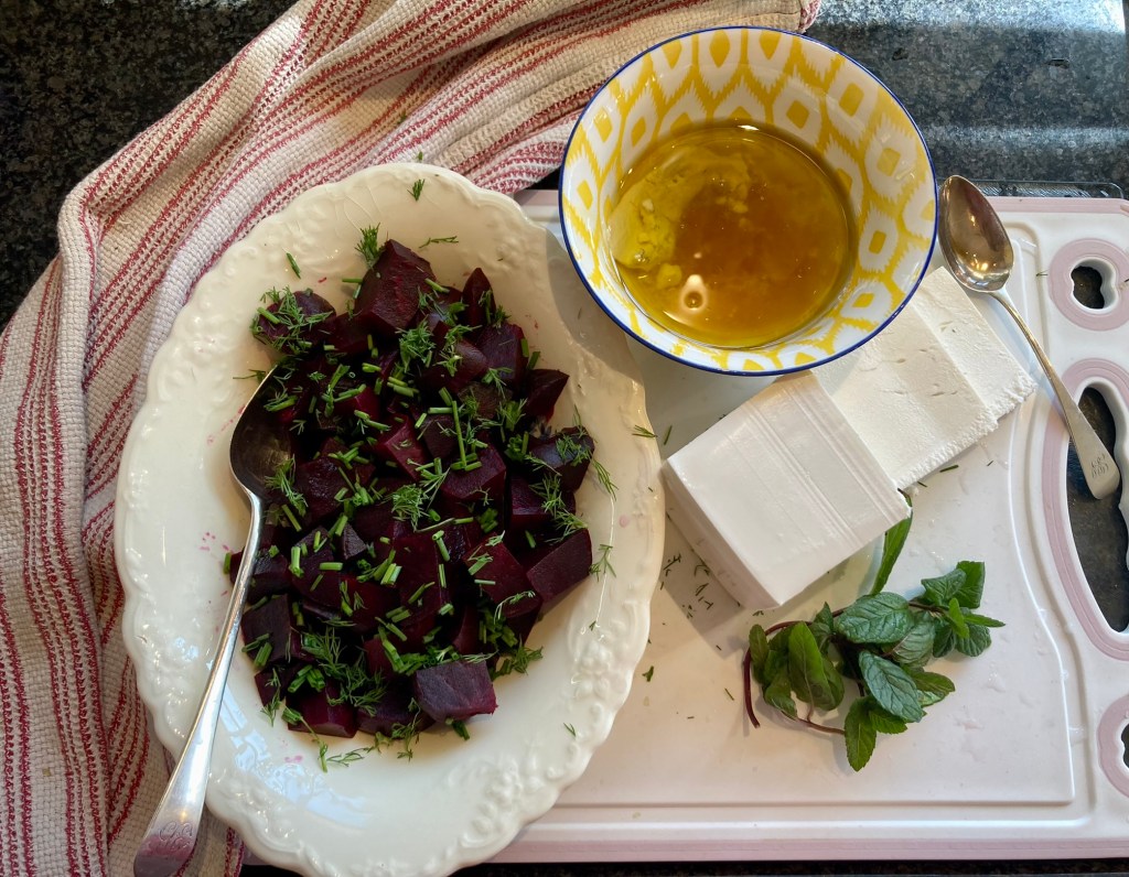 Roasted, peeled beets are extremely high in antioxidants and iron. Another superfood. You can find them prepackaged in the supermarkets (and in the US, at Trader Joe’s). I developed this recipe with a couple Israeli/ Mediterranean twists. I use a goat feta that is very very low in salt and very firm and mild. It comes in a block submerged in water, and can be cut into smaller cubes. Hopefully you will be able to find something quite similar. Fresh dill is found in many recipes here, as is mint. The two together make this salad really fresh and the dressing is a twist on the Israeli lemon juice and olive oil.