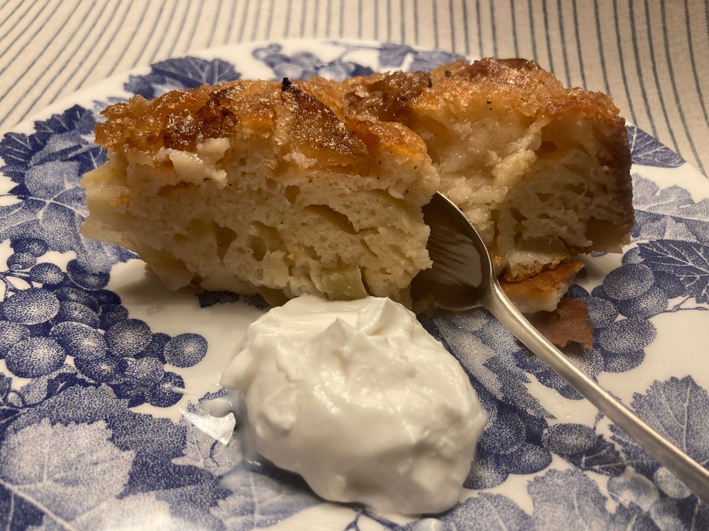 Our other neighbor, a Ukrainian refugee who is living with her host family, brought over a wonderful Apple Charlottka, which was kind of like a pancake, but different. She serves it with a dollop of sour cream. Amazing! I got the recipe and made one after this was rapidly devoured. It’s really easy to make, and the ingredients were on John’s diet list.