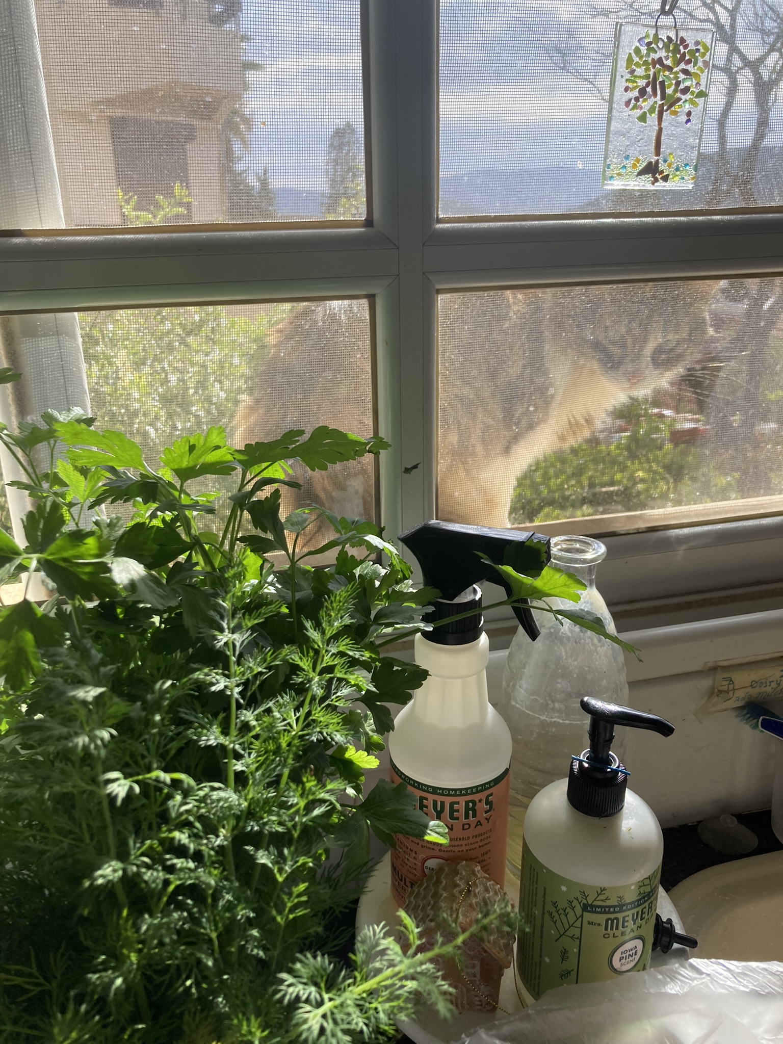 I’ve made a big casserole of Mac and Cheese from scratch, and several egg dishes including this one quiche. Usually coming up with new recipes is successful, but there are occasional flops. The tuna quiche was one of those disasters. It was crustless with a sliced potato base. I loaded it up with spinach, peeled finely grated carrots, cheese, and a lovely custard. Coming out of the oven it looked absolutely glorious, but it smelled and tasted like cat food. It was pretty gross, and the neighborhood felines had quite a treat. So much so, that I believe I’ve made a new friend. She comes around to my kitchen window every morning now.
