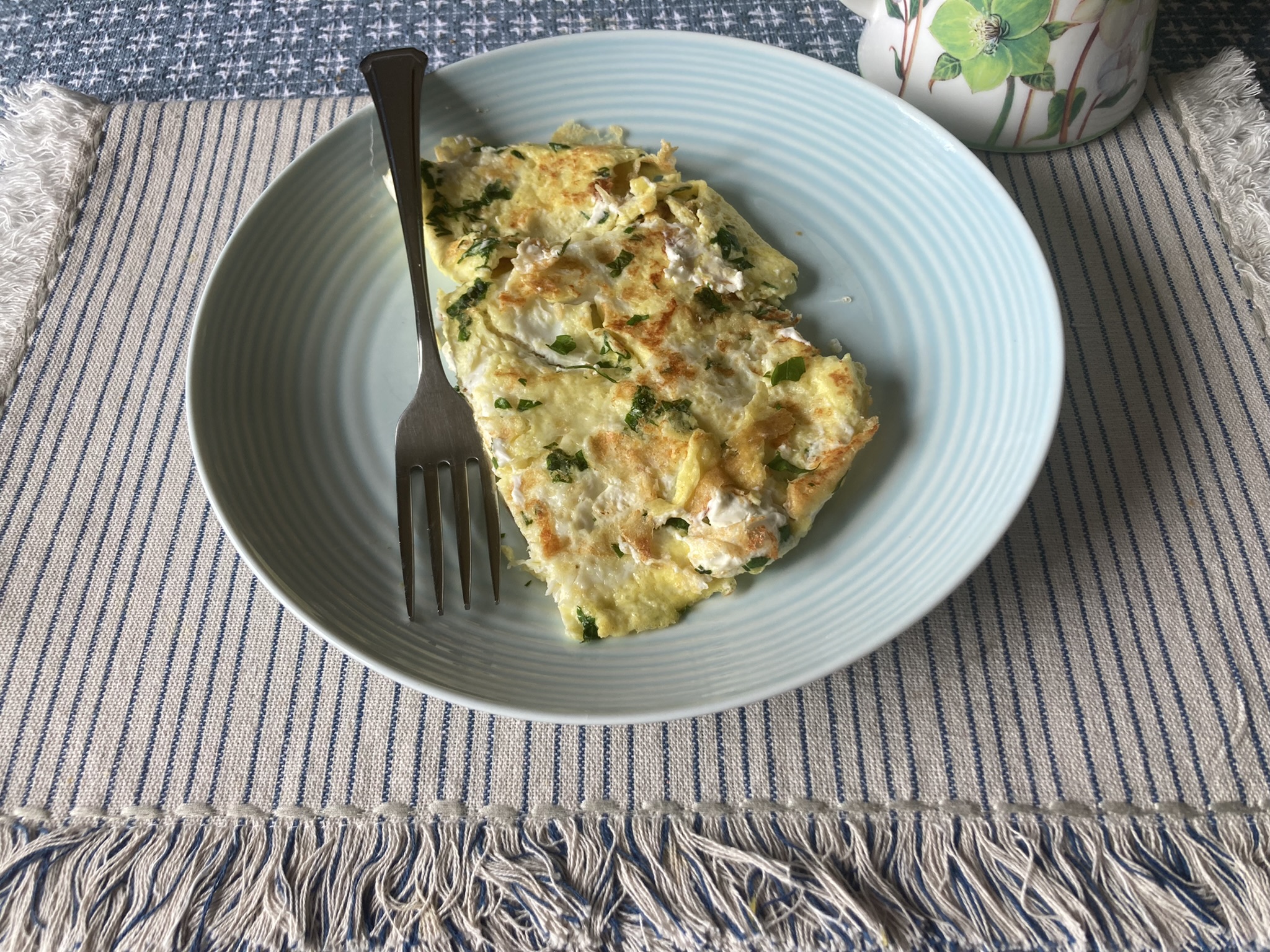 Melt butter on medium high flame in medium sized pan. Scramble the eggs with a splash of milk. Finely chop all the herbs and the onions. The onions should be a teeny, tiny, mince. Put the eggs into the pan and let sit. The edges should brown slightly. As bubbles for they can be popped. Sprinkle half the herbs on the eggs, which should be undisturbed and completely flat. Flip the eggs and let brown slightly on the other side. As they are cooking, sprinkle the feta and remaining herbs and onions over top. Fold the edges over so the eggs look like a rectangle or fold blanket. Slide onto the plate. It can also be put into a sandwich with a sh ear of cream cheese and mustard. Really!!!! Try it. The combo is surprisingly good!
