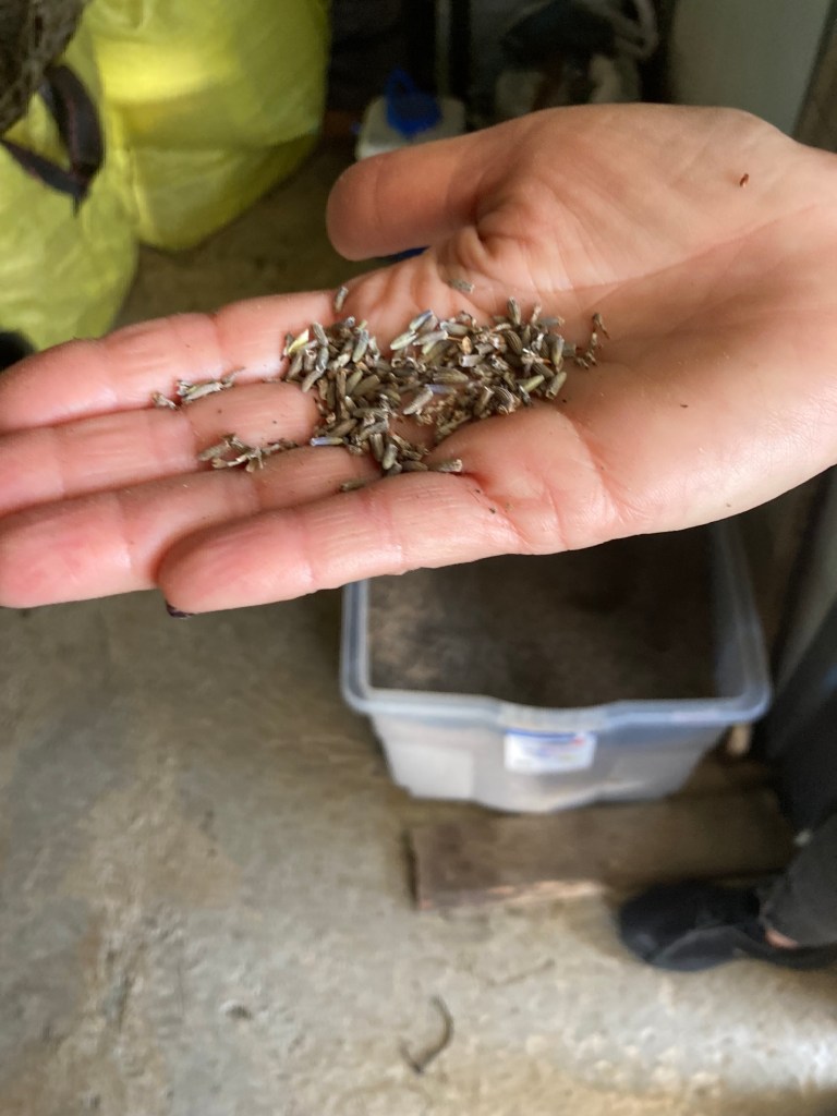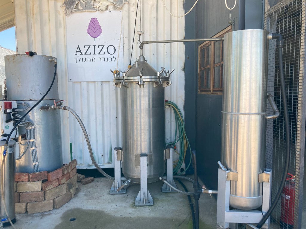 They traveled the world – to France, Hungary, Bulgaria, the United States, to visit other lavender growers. The Israeli Volcanic Research Institute was called in to examine the Golan soil. More irrigation was installed and more dunams were planted with heat tolerant, high yield varieties. Now six different types are grown and new cultivars are being tested. The Assrafs used to pay the teenagers on the moshav to harvest the crops, but now they have a special lavender harvester. Lilach took us and two other couples on a guided tour of the farm and explained the process and manufacturing. We went into the drying room. The smell!!!!! The lavender stalks hang for weeks in a special atmospheric controlled room as they dry, preserving the oil content. Dan and Lilach re-engineered a chicken plucking machine into a device that separates the dried seeds from the stalks. All the distillation is done on site, the oil separated from the hydrosols (water), and both used for different products. The distilling machinery was purchased in Bulgaria, famous for the distillation of its famous roses in the manufacture of perfume. The Assrafs called in Professor Nativ Dubai of the Neve Yaar Agricultural Research Center to confer on varieties of lavender suitable for the climate that would produce highest yield of flowers per plant and the highest concentration of essential oil.