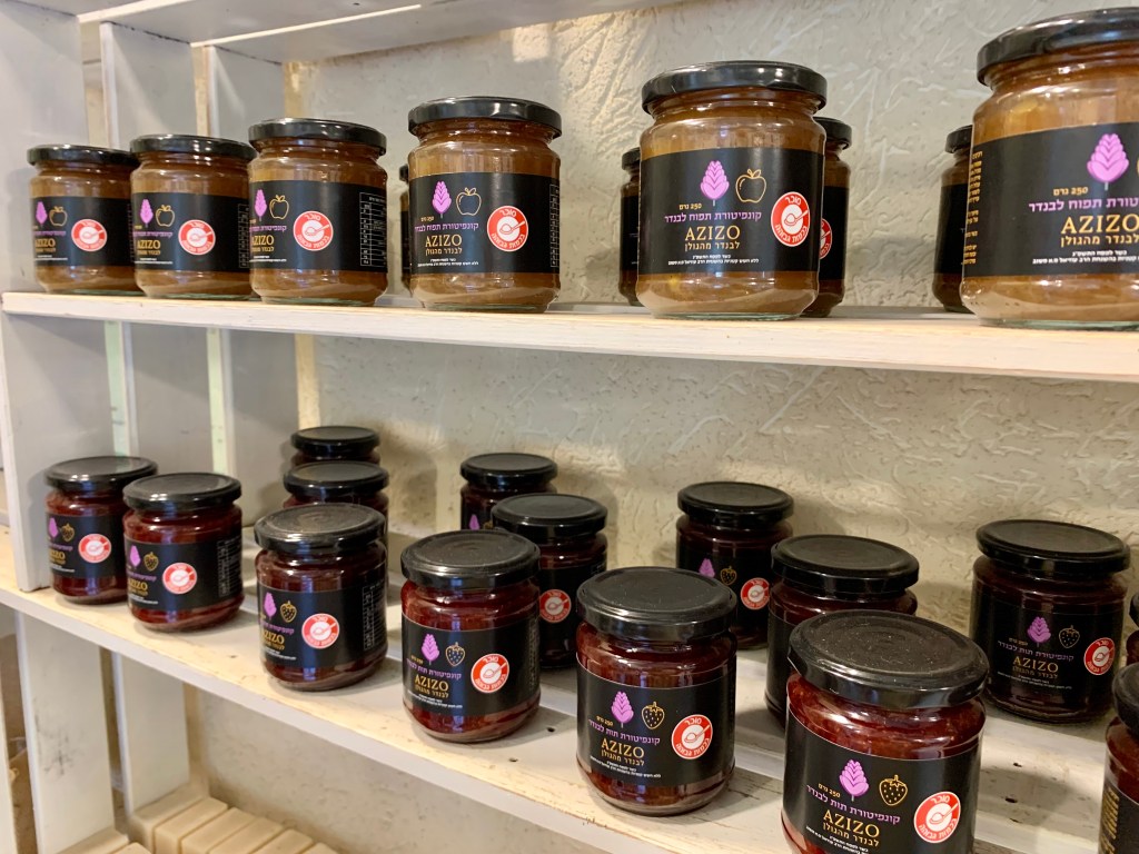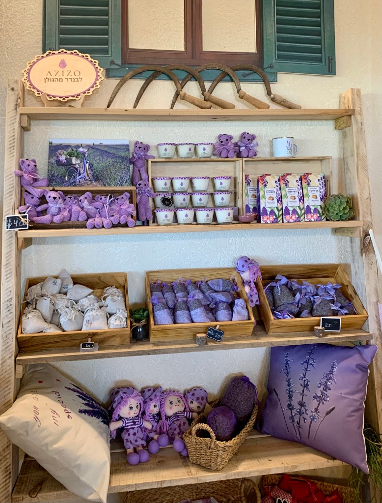 After over 40 years farming lavender, Dan and Lilach have finally given up their secondary jobs. All of their time is now devoted to Azizo Lavender, which has also become part of the eco-tourism industry in the Golan. Everything they do is sustainable and environmentally friendly. No pesticides are used in the growing and no chemicals are added in the production process. All of the labor from fieldworkers to cafe and gift shop employees live on Moshav Kanaf or the surrounding area. The gift shop is, of course, loaded with all things lavender. I bought a case of the liqueur. Now that summer is almost here, it’s amazingly delicious on vanilla ice cream, melon, or in a drink made with a tablespoon of the nectar with a spritz of soda water. I bought some sachets, a candle, and the ground dried seeds to use in cooking. John got a pot of bug balm for insect bites and a little vial of the essential oil for our diffuser. We ended our tour by splitting a small pizza with dried lavender sprinkled on top… it was very different, and very good. And we had the lavender ice cream for dessert. It’s definitely a place we will return to with guests. The views are spectacular and the hospitality “welcoming Israeli.” Admission is free.