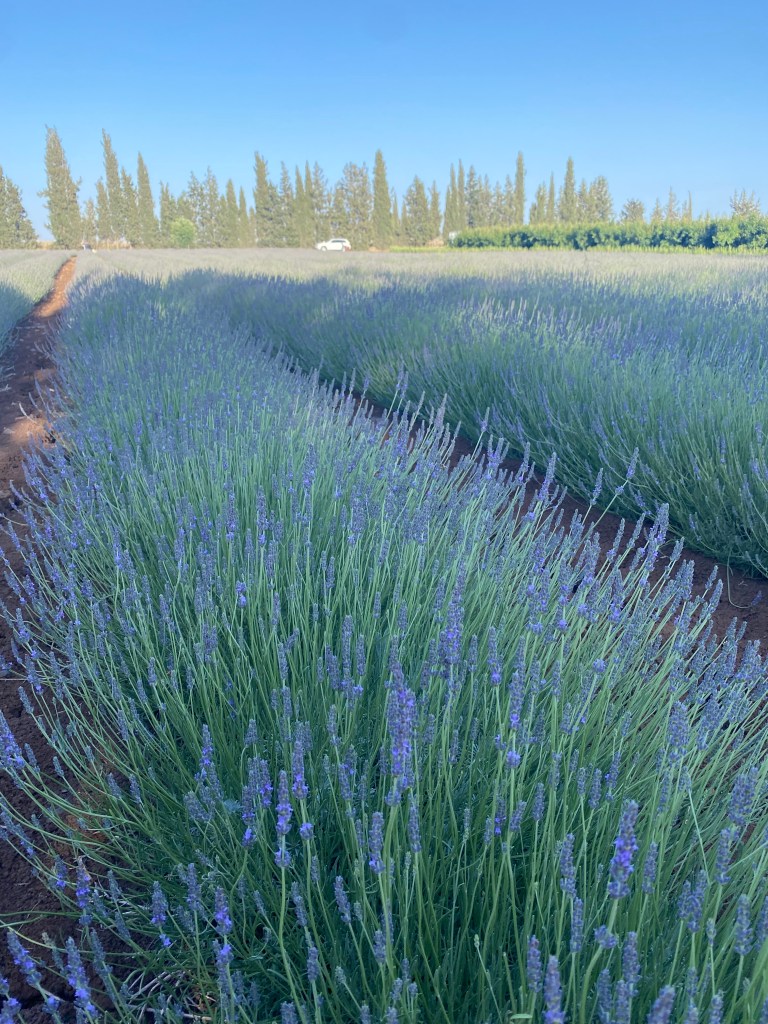 The rains and winds and chilly days are hopefully behind us here in Israel. It’s tiyuulim weather! In Hebrew a tiyuul is best described as a day-trip, and Israelis are crazy about them. I’d heard about Azizo Lavender from a friend who brought us the most heavenly lavender liqueur, so we decided to drive way up in the highest parts of the southern Golan Heights. The mountains were still spring green and the wildflowers were in full bloom making splashes of pinks and purples over the ridges and wadis. On a high plateau overlooking the Kinneret (Sea of Galilee), we finally pulled into Azizo Farms just outside the tiny moshav of Kanaf.
