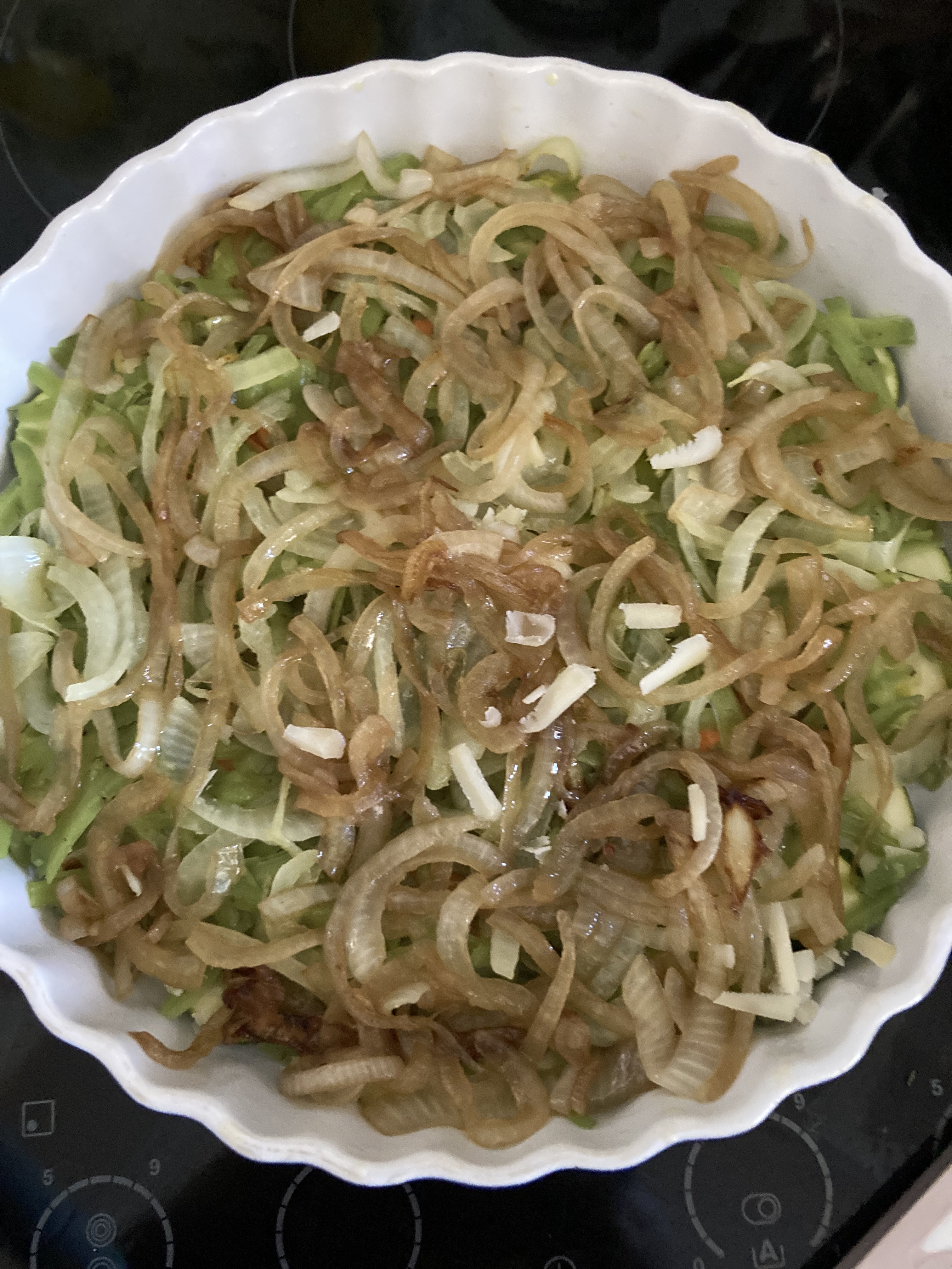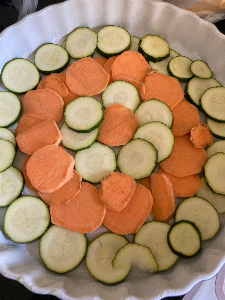 Preheat oven to 350*F/180*CGrease a large, flat, round baking dish with olive oil. Layer the zucchini and sweet potato slices in concentric circles. Sprinkle all the first cheese evenly on top. In a large skillet, heat olive oil and sauté onions until soft and carmelized. Spread evenly atop the cheese layer.