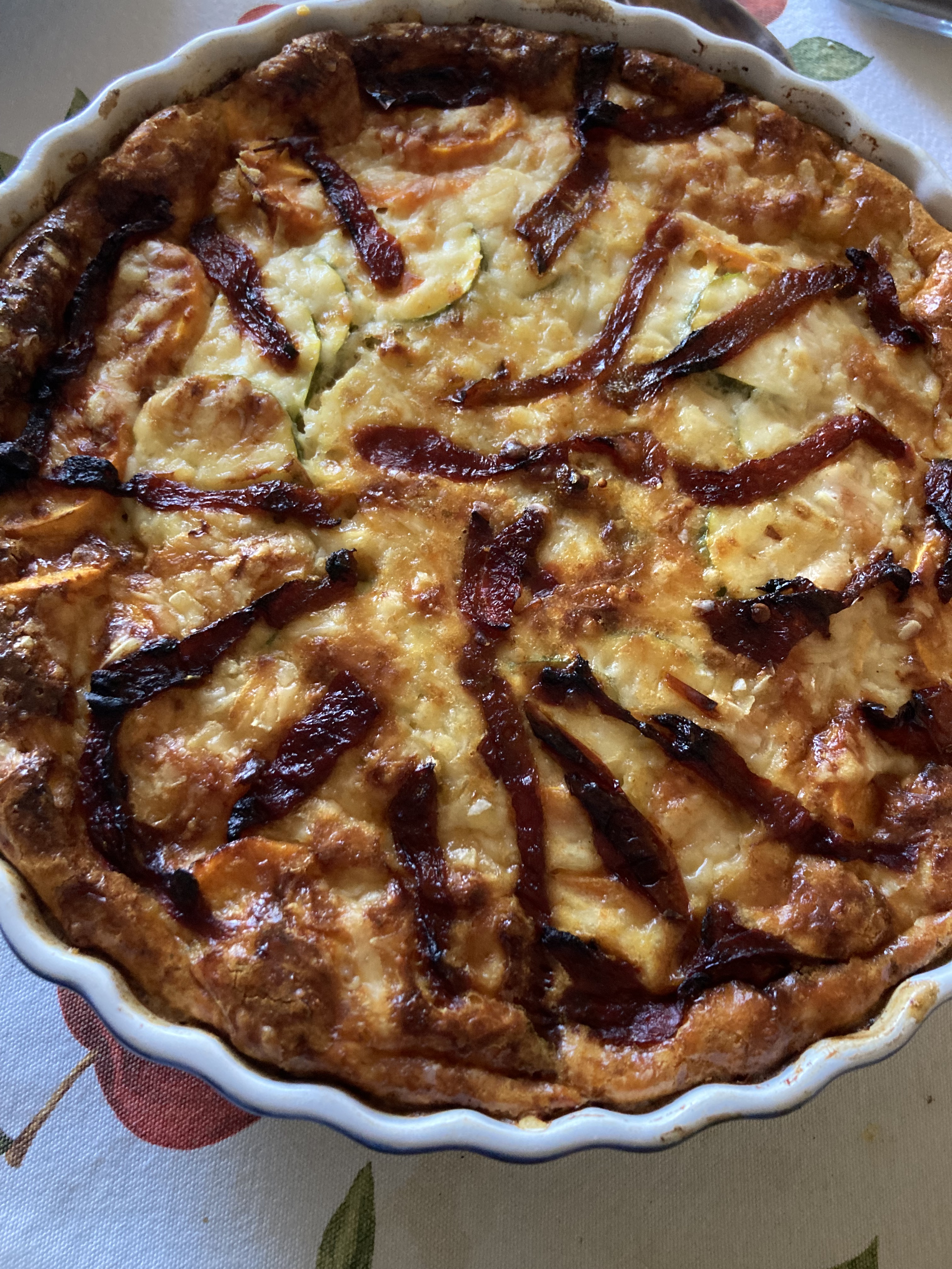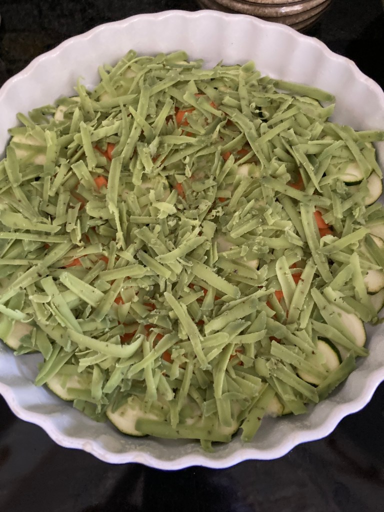 So when I told my daughter I was making a pashtidah (pronounced posh tee DAH) for Sunday, she started laughing hysterically. I told her it was a crustless quiche served in Israel and everybody makes their own version. she said, “Oh, you mean a frittata.” No. No. A fritata just has eggs and is broiled until it browns on top. This has lots of veggies and a custard. She thought I made up the word. Whatever! It’s delicious, so enjoy-