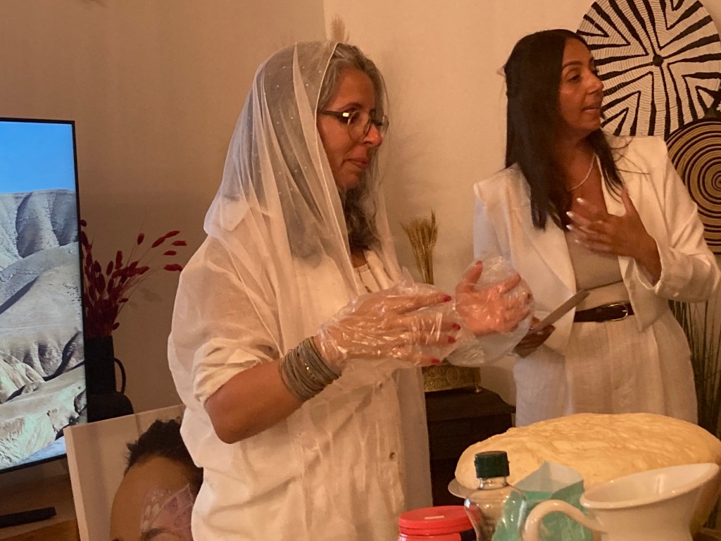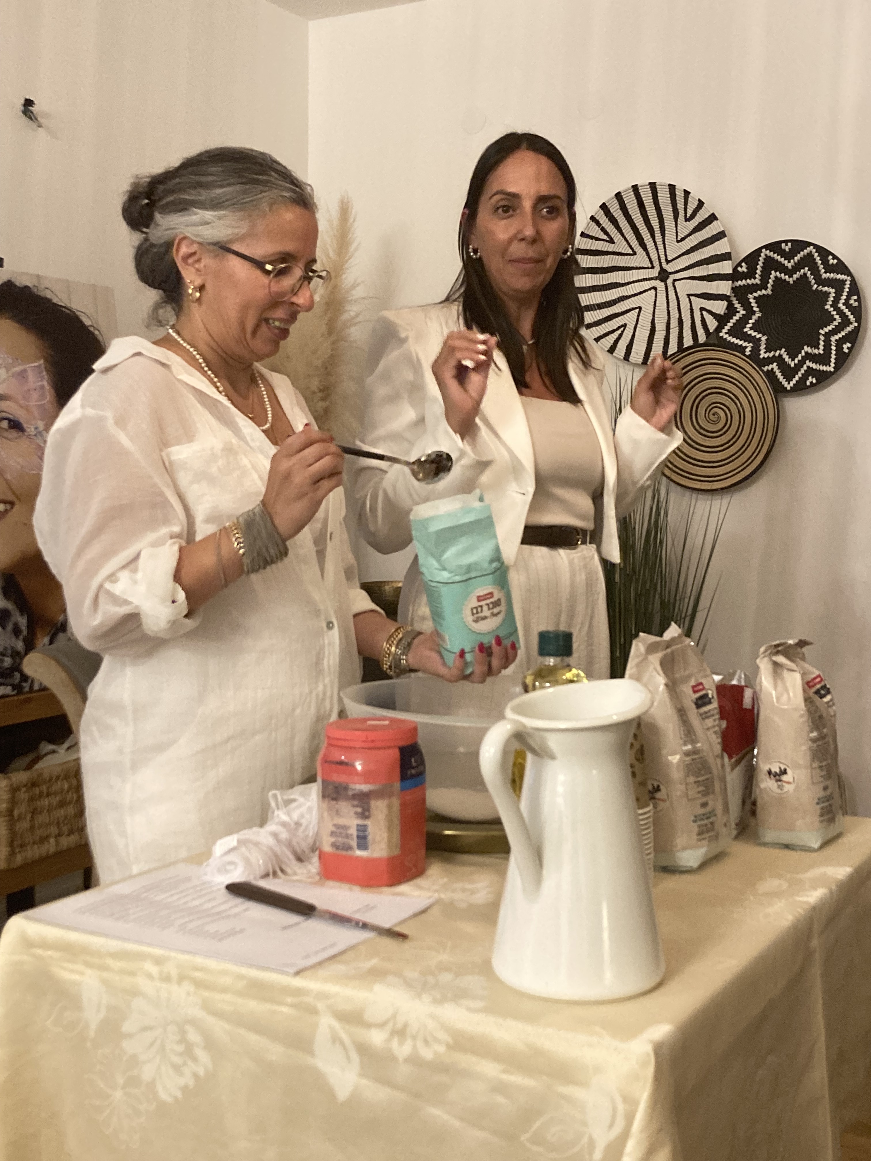 As Karinne was beginning to make the challah bread, Liat took us through the symbolism of each step in the process. We start with warm water. The universe was formless and void except for the “waters of the deep.” Then the Spirit of G-d hovered over the waters – in goes the yeast. The waters were activated. G-d created the planets and the earth through pure love, an act of complete sweetness – add to the yeasty water, spoonfuls of sugar. Out of the dust of the ground, man was formed – flour was added and the dough begins to take shape. Salt and oil were also added (but I didn’t fully understand the comparisons that were made, so if anyone cares to chime in….)