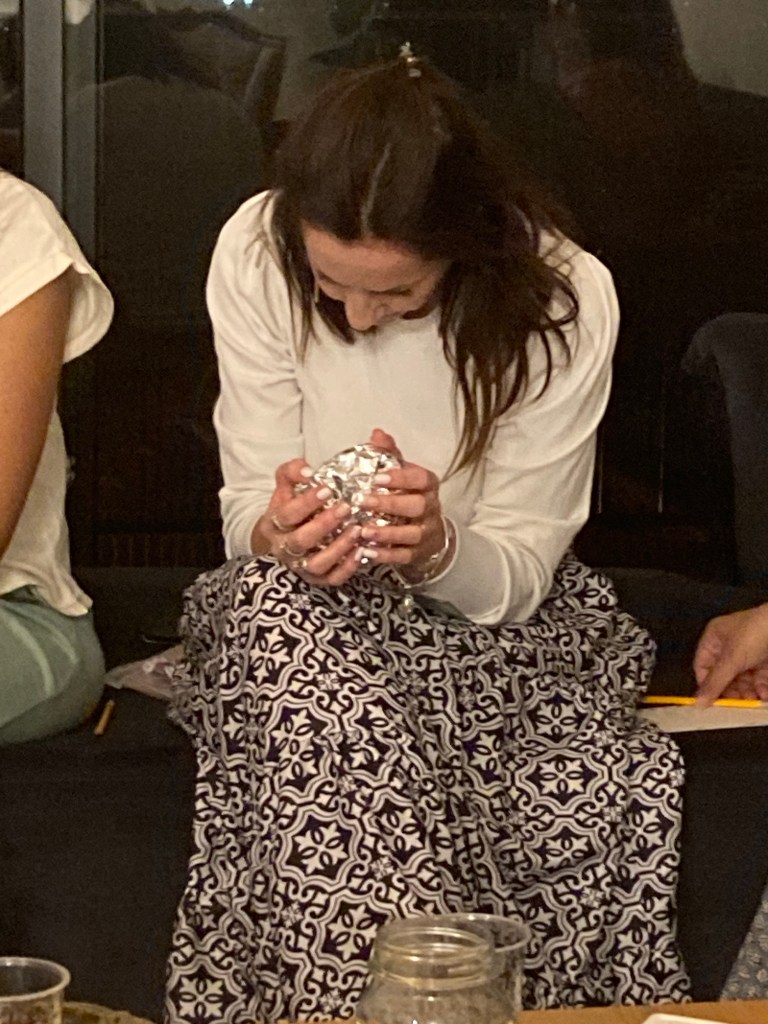 Just as the protein and gluten holds the dough together, the woman holds together the family. Because she has a nurturing nature and can see things in a different light, she is essential to the workplace. She is able to do many different tasks simultaneously. But when she is “placed in the oven” so to speak, if she does not watch out, it is easy for her to burn out. There were so many lessons to be learned from this women’s class. The most touching moment was when Karinne wrapped the challah (that separated lump) in foil, and said a personal prayer as she held it. She then passed it to me, to add my petitions to G-d, then pass it on to the next woman until all woman had attached their prayers to the ball of dough. Then it was placed on the bottom of the oven to be consumed by the heat.
