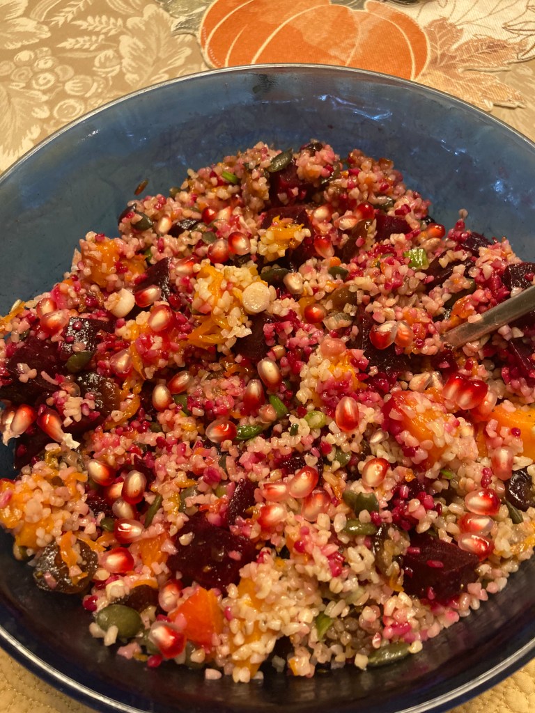 Pour the dry bulgur groats in a bowl and pour the boiling water over the top. Let sit for about 10 minutes. When water has been absorbed, fluff the bulgur up with a fork. add in chopped scallions, chopped dates, chopped roasted pumpkin or squash, cranberries and pomegranate arils. In a small saucepan dry sauté the pumpkin seeds or add a little olive oil and fry them until they pop. Remove from heat and let cool. Add to bowl. Dress with Brianna’s Blush Wine Vinaigrette or a sweet vinaigrette. Add beets just before serving as their color spreads onto the other ingredients.