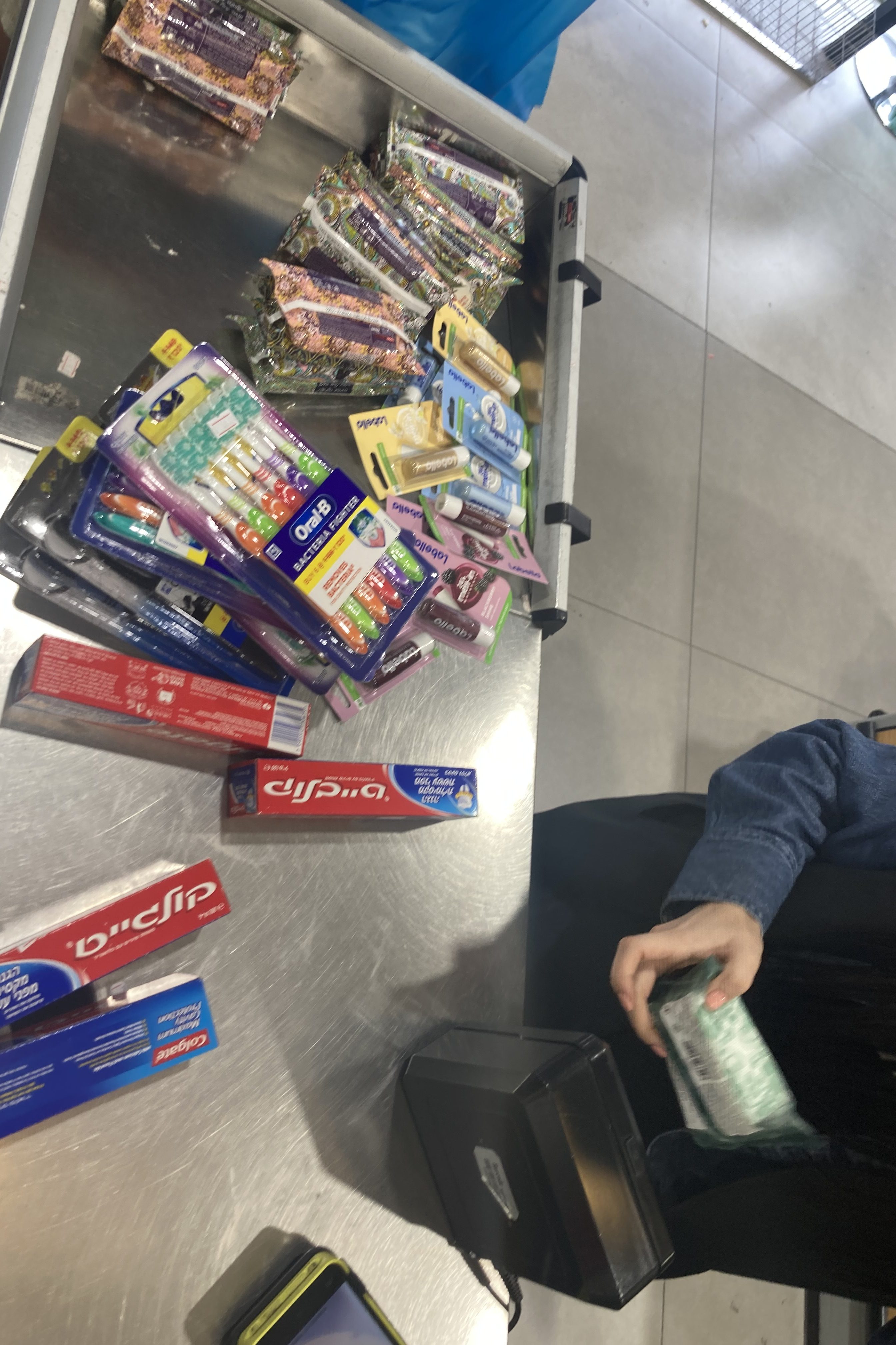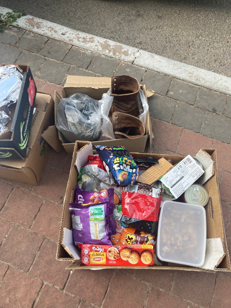 Besides, there was major work to be done. It started with us and two other couples from the States. I had gotten requests from reservists in need of supplies. My friend found out about other supplies needed and a drop off station in our city. John and I were prepared to go up to the main soldier drop off in the afternoon (way up North), but this was even better. We scoured “zol stores” (cheap bargain stores like Big Lots in the US) for toothbrushes, toothpaste, wipeys, lip balm, sunscreen, deodorant, feminine hygiene products. John went to the pharmacy for masks (heavy dust!!!). Then to the camping store and bought 20 pairs of military boot socks. And I went to the groceries and minimarkets for gum, sweeties, coffee packets, sugar, crackers and chocolate spread (a huge thing here), six packs of water. When we got to the drop off, there were a good amount of people unloading things. Old military uniforms and boots. Lots of foodstuffs. Even soups, muffins, casseroles, breads, cookies and brownies, sandwiches, tons of homemade items. It seems everyone who isn’t enlisted has gotten on board. Gino and Della, if you are reading this, we speak of you so often… but now!!!! We remember the same types of things for the soldiers in Iraq or Afghanistan, and of course, Operation Shoebox. So we had great experience.