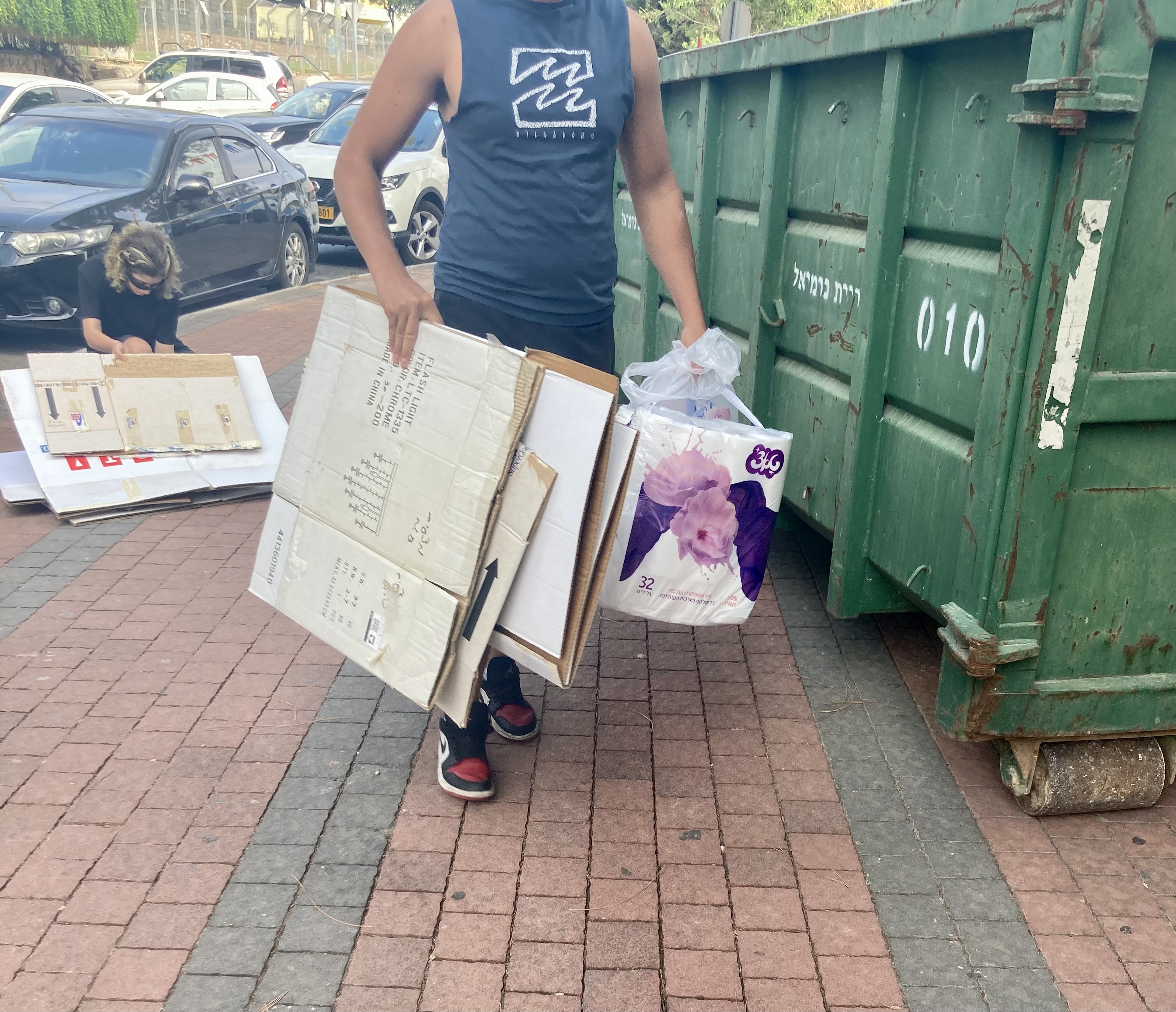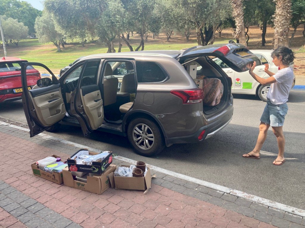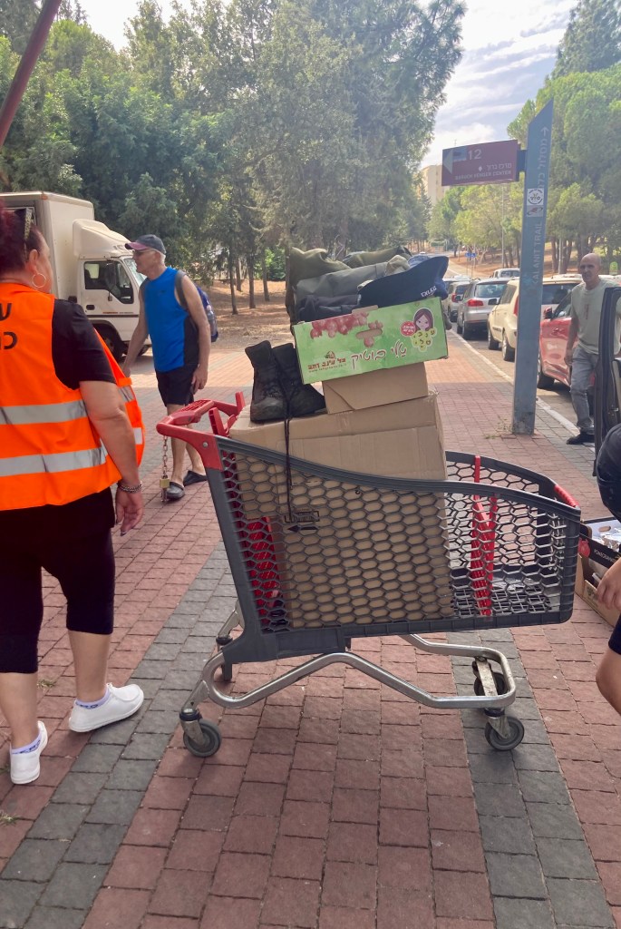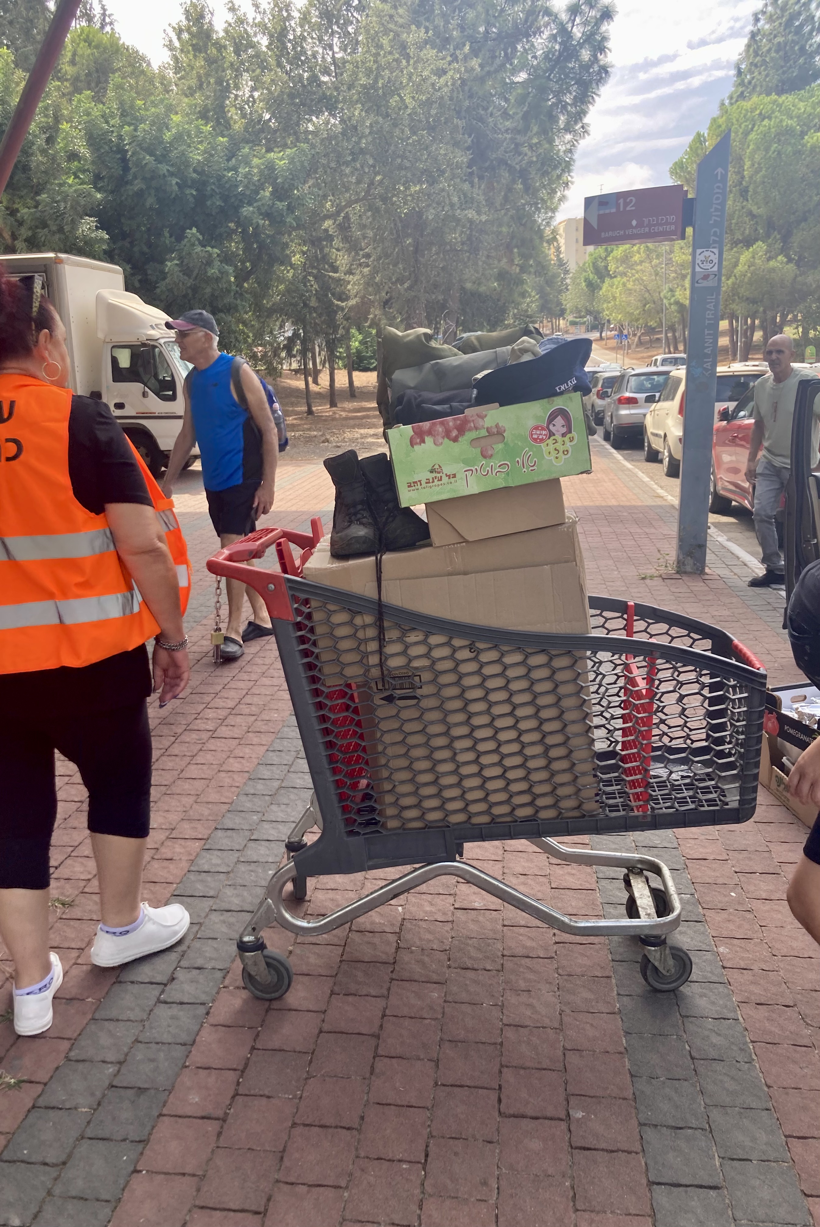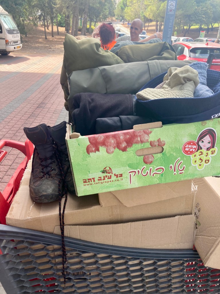 Not allowed to film inside, but there were so many volunteers! Sorting the donations into like piles and boxing up in cartons to take to the trucks. From there the things would be unloaded and given out as needed. This was all so familiar to us, except that everyone was speaking Hebrew. Our other friend had another Israeli moment. He spotted a jeepload of reservists stopped along the freeway waiting to pick up their friend. Moti stopped to ask if they needed anything, anything at all. They responded that mats to put under their sleeping bags would be great, but they had no way to get them. He said, “wait here for a while. I’ll be back.” moti went to the camping supply store which was open, and bought 10 mats at cost. the owner threw in an additional 5 no charge.” Of course, the soldiers were incredulous, elated and very grateful.
