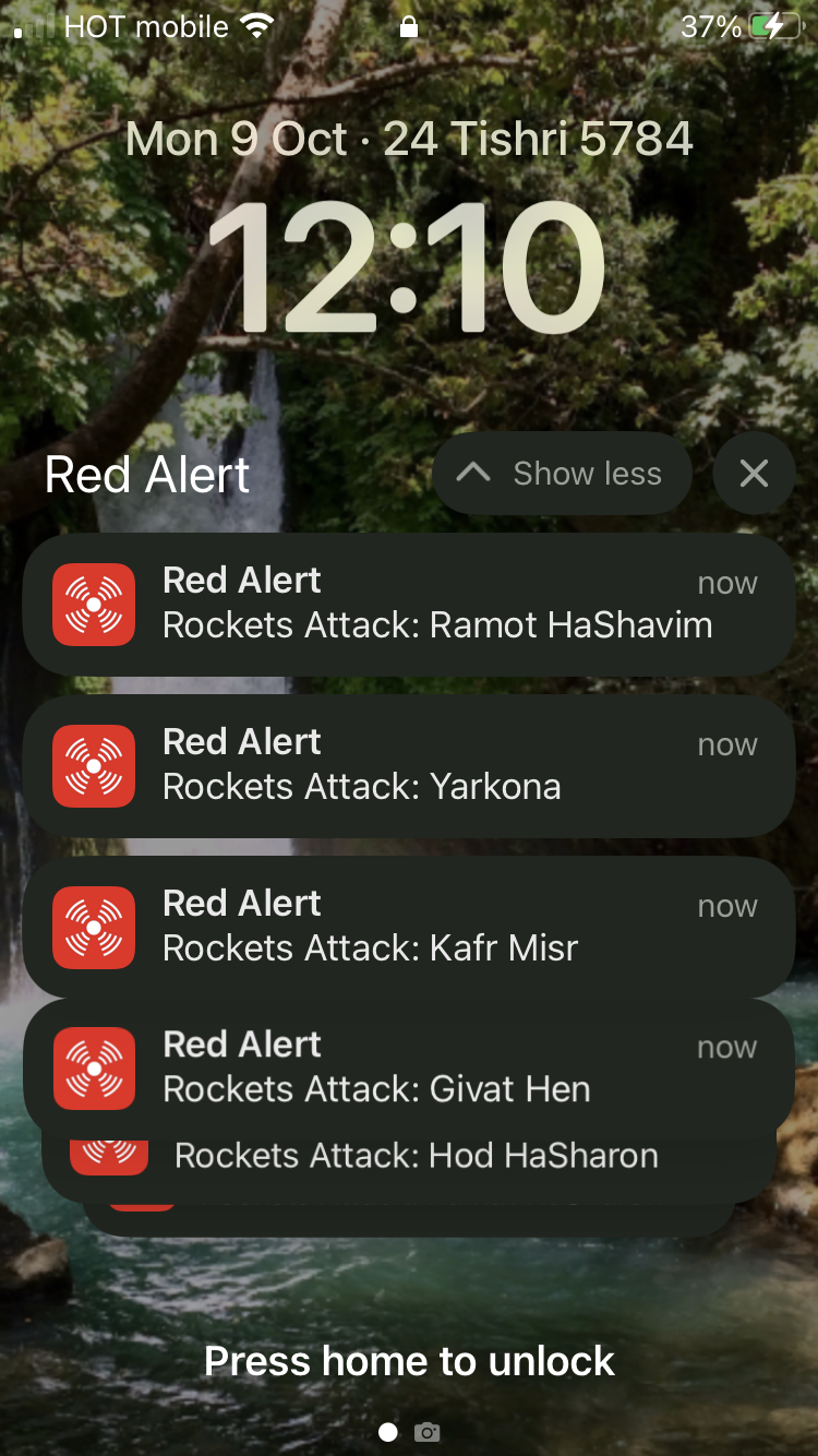 I walk around in a daze, over pouring coffee into my mug and adding mangoes to my green salad instead of the fruit salad. Putting away dirty dishes and washing the clean dishes. go figure – But we are well. We are safe. We are blessed. We are thankful. It really helps to have a sense of humor. John cracks Monty Python jokes about the Peoples’ Front of Hizbulla, the Hizbulla Peoples’ Front, the Popular Peoples’ Front of Hizbulla. It breaks up the nerves as the missile barrages from Gaza into the center of the country are still nonstop and my phone gets the red alerts by the second.