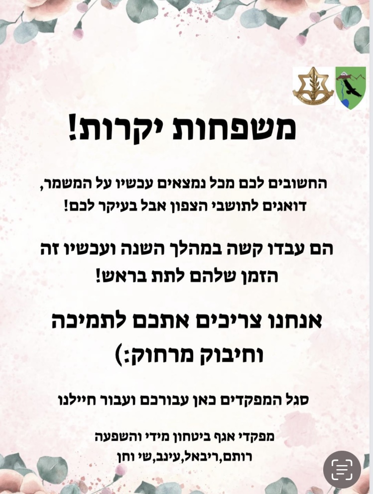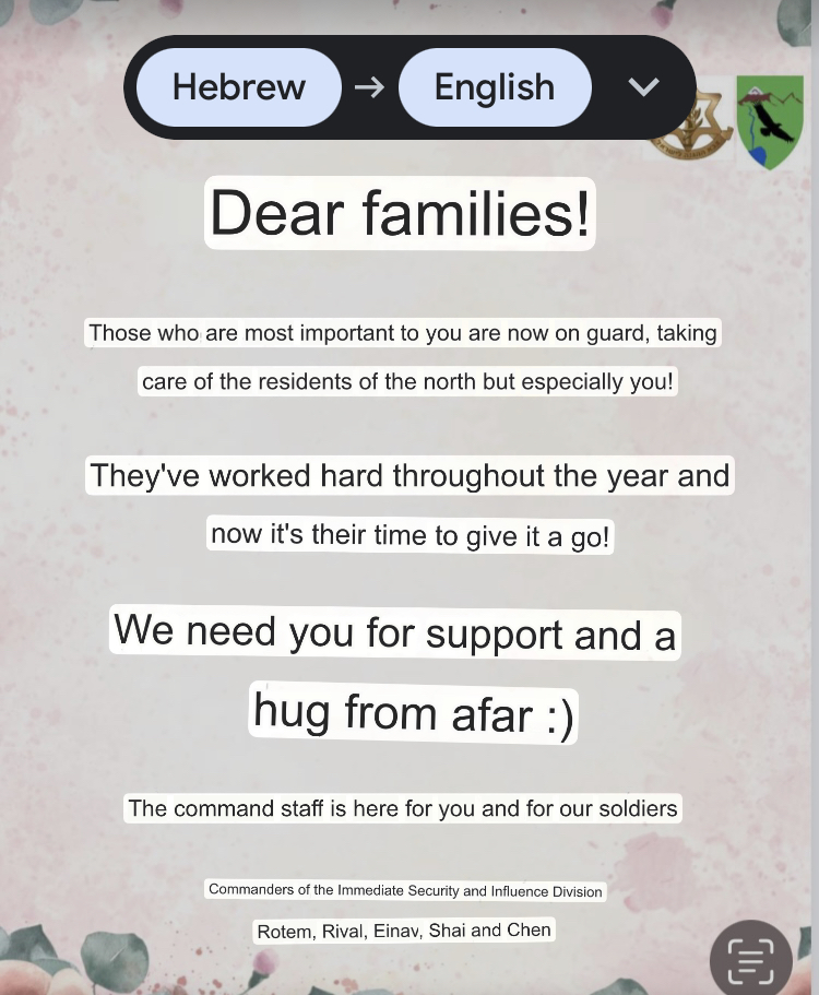 Know that the soldiers are working hard to keep all borders secure. Many of the reservists are helping in admin and to keep the country running almost at normal capacity. We are staying close to home. We are safe. I heard from Max this morning- a Sponge Bob meme of him and Patrick in a bunker. I sent Max back a Dwight Shrute meme. It’s all good.