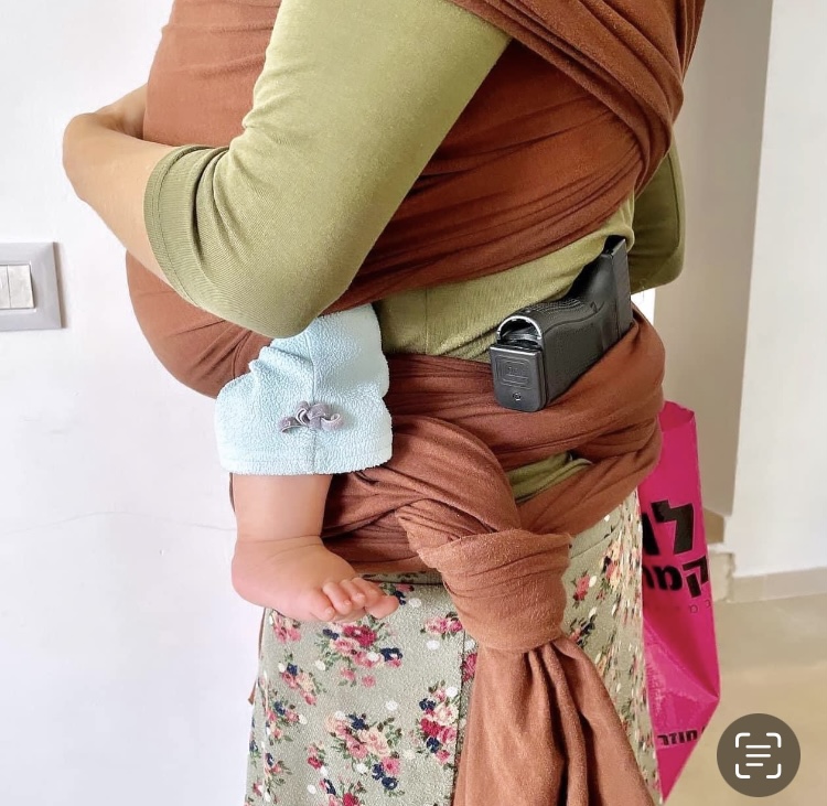 I’m receiving so many stories- acts of bravery and heroism coming from both civilians and soldiers in the hospitals. And acts of selflessness and kindness between friends and neighbors. Here is a photo my friend, Keren, took, of her daughter this morning. They live in an area surrounded by ‘sketchy’ villages. ranaana’s husband has been called up and she needed to run errands. It’s so sad that she feels the need to do this, but here in Israel self-defense is of utmost importance as is defending the life of a child (she has a 14 month old in the pack and is 4 months pregnant). It’s a powerful picture!