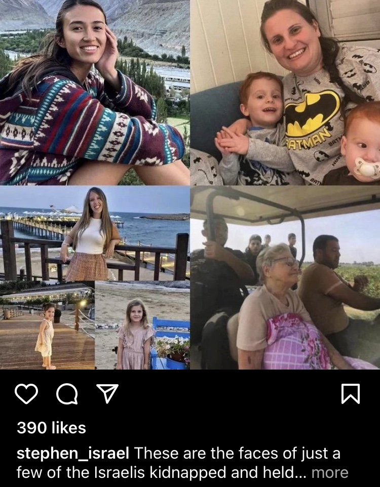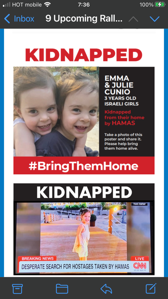These are just a few faces of the kidnapped children now being held in conditions that only G-d knows. Posters have been put up in public squares throughout the world…. And have been ripped down numerous times by pro-Palestinian sympathizers. (We located our dear friend, a lovely American Israeli artist who had been a concert-goer. A friend found her post on Facebook for me. Instant sigh of relief!!!)