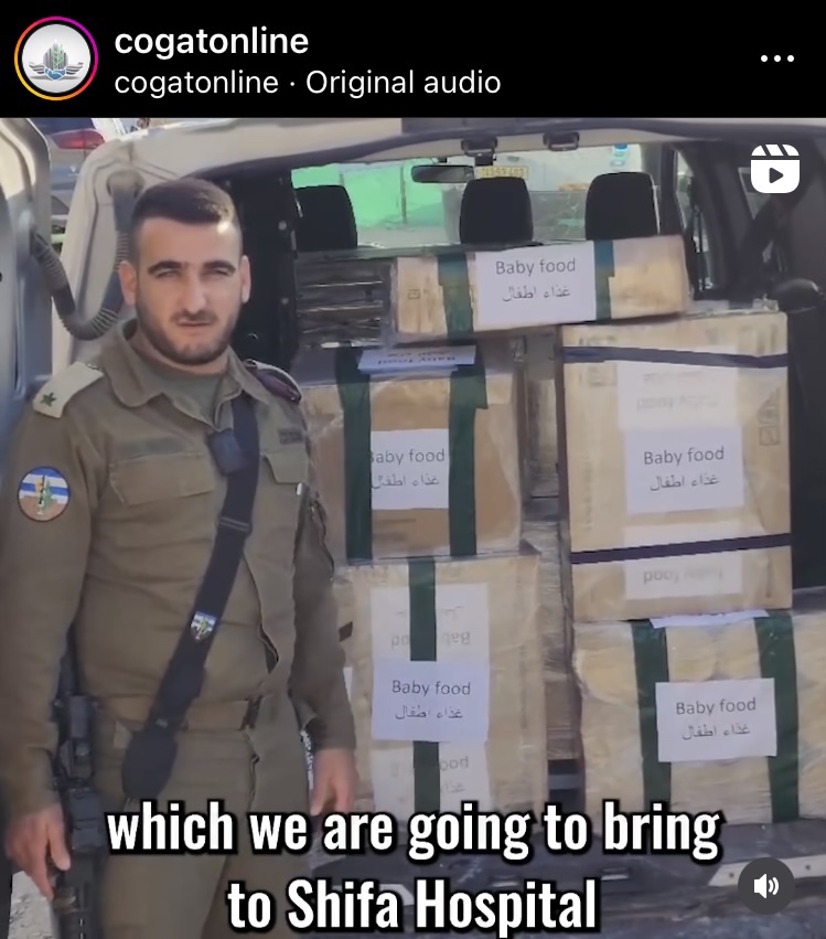 There is an organization called COGAT, Coordinator of Government Activities in the Territories. It is a noncombatant IDF unit that actually works very closely with the Palestinian Authorities (West Bank) to coordinate humanitarian aid, civilian issues, diplomatic efforts, international relief, economy and infrastructure. COGAT works in tandem with the UN in both the West Bank and also in Gaza. They have been directly responsible for delivering humanitarian relief to the civilians of Gaza and to Shifa Medical Center. They coordinated efforts to provide the hospital with incubators to transport premature babies and infants in distress.