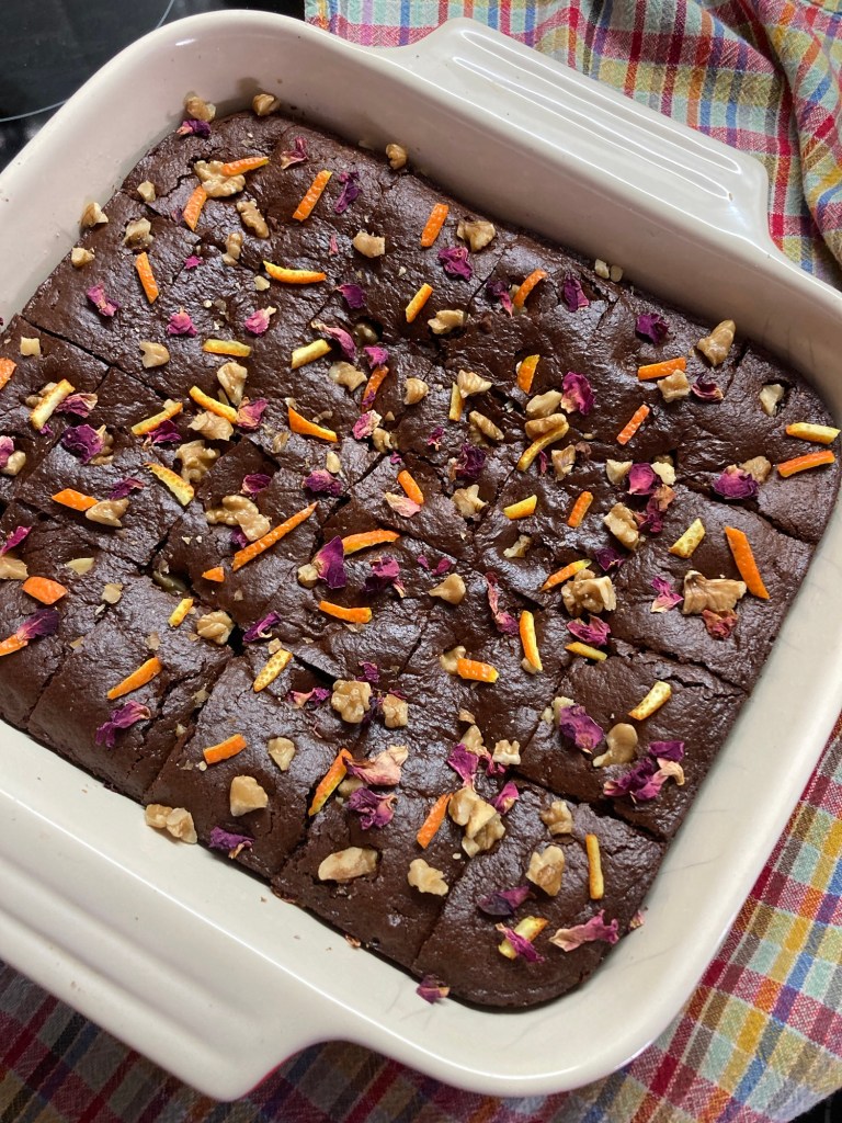 Preheat oven to 360*F/170*C. Grease a 9X9 baking dish. Wash orange well. Cut in half. Remove the peel from one half (eat slices of orange). Juice the other half, removing any seeds. In large bowl, add Techineh, eggs, syrup and sugars, orange juice and combine well (I use a simple wire whisk) until smooth and glossy. Gently fold in cocoa, flor, baking soda and salt. Combine until dry incorporated into wet ingredients. Fold in chocolate chips. Pour into pan and smooth out. Bake for 25 minutes until top is set but brownies are not dried out. Remove from over and let cool 10 minutes. Cut into squares. Cut up orange rind into thin thin sliver bits. Reserve about 3-4 TBSP. For a festive look…edible and delicious…. I scattered the Orange rind along with some dried edible rose petals and chopped pistachios.