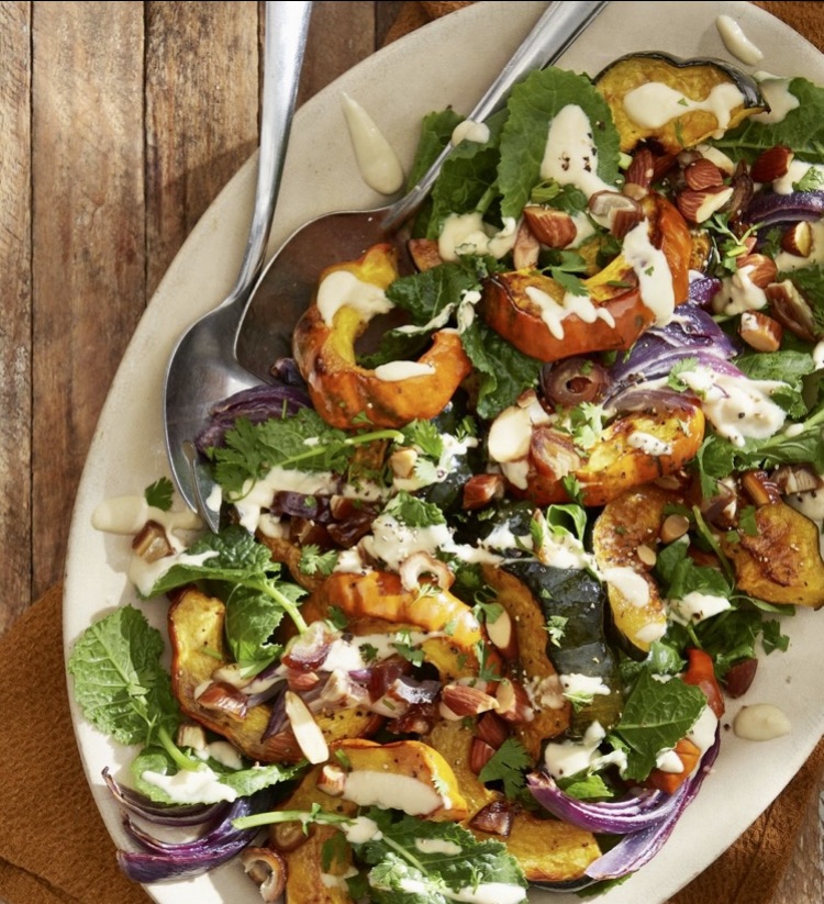 So on a bed of fresh picked lettuce, I put some of the sliced of roasted gourd, half a red onion, sliced, 1/4 cup dried cranberries (no sugar or preservatives), 3 chopped pitted dates, about 1/4 cup chopped almonds aand chopped walnuts (altogether), you can sprinkle fresh pomegranate arils on top.