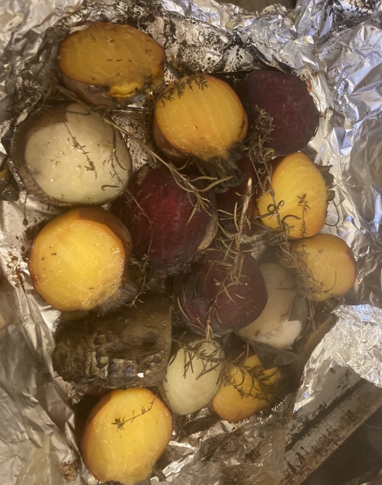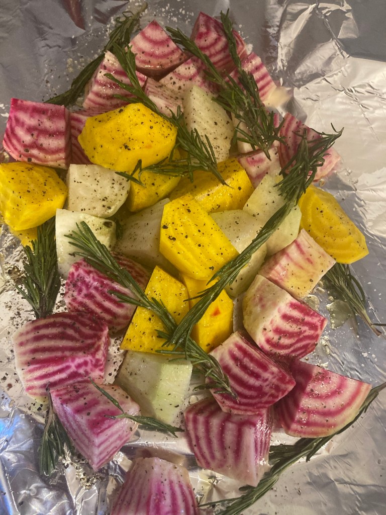 So… for lighter matters. And a complete switch-up as Shabbat is this evening. The vegetables here have been off the charts. I have a small rooftop garden, and between thunderstorms, we harvested our remaining root veggies. Mostly yellow beets, white beets and chioggia beets. I peel them and shave them raw into salads. Healthy, gorgeous, sweet and delicious. Also after peeling and quartering, I roast them in foil with a splash of olive oil and sprigs of lavender and rosemary (also from my window boxes).