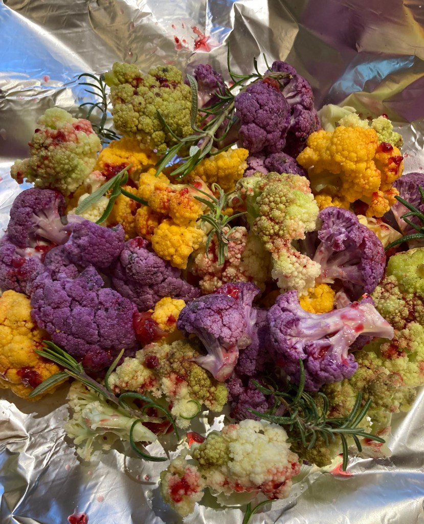 I cut up and roasted the cauliflower (yellow, purple, white and green heads!) with rosemary, a squeeze of blood orange juice, a splash of olive oil and a sprinkle of sea salt.