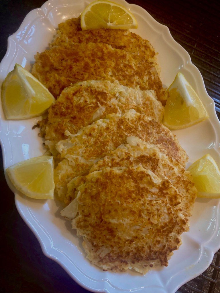 Now, the cabbage. I saw a recipe in ‘The Nosher’ (highly recommended site) for cabbage schnitzel. Chicken schnitzel is without a doubt the #1 comfort food here. My Aunt Anne used to make my dad, her little nephew ‘Miltie,’ this cabbage schnitzel and he loved it. It brought back fond memories, so I made it, but pumping up the volume on flavor. I made a plate for dinner, but John thought they were treats, so I hope to have some left by tonight-
