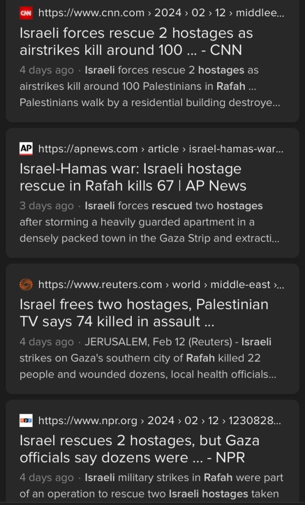 I find it interesting that none of the news sources could agree on the number of people killed by Israeli forces that night. Some reported dozens, others 67, 74, hundreds. Most rely on Gazan ministry of health reports. The IDF stated that during that particular operation, 36 were killed in heated gunfire including 2 senior Hamas operatives and the 3 guards. Honestly, it’s hard for the general public to know what to believe.