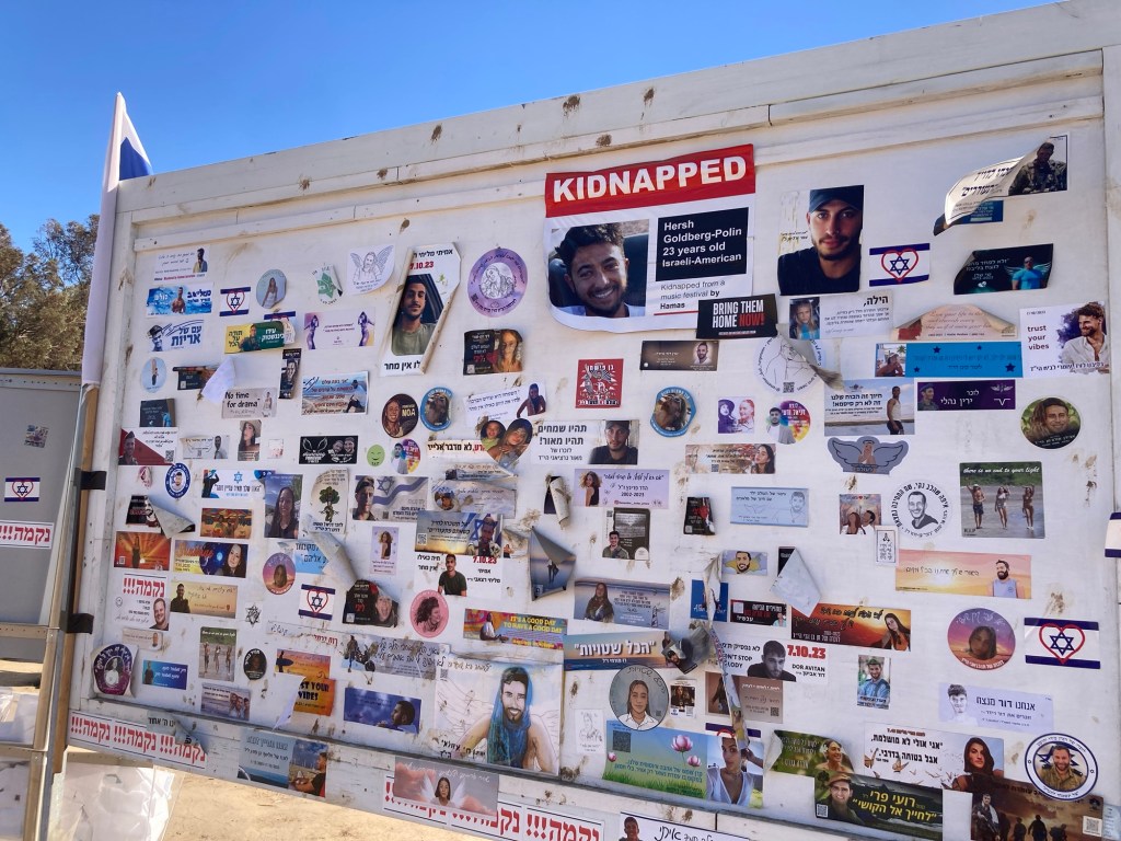 A few meters further between the bomb shelters (placed there since the event) and the siren is a wall of the missing. It reminded us of the days post September 11, 2001, when the world changed forever then, too. Photographs and names of those abuducted. 150 days now. 5 months in hell.