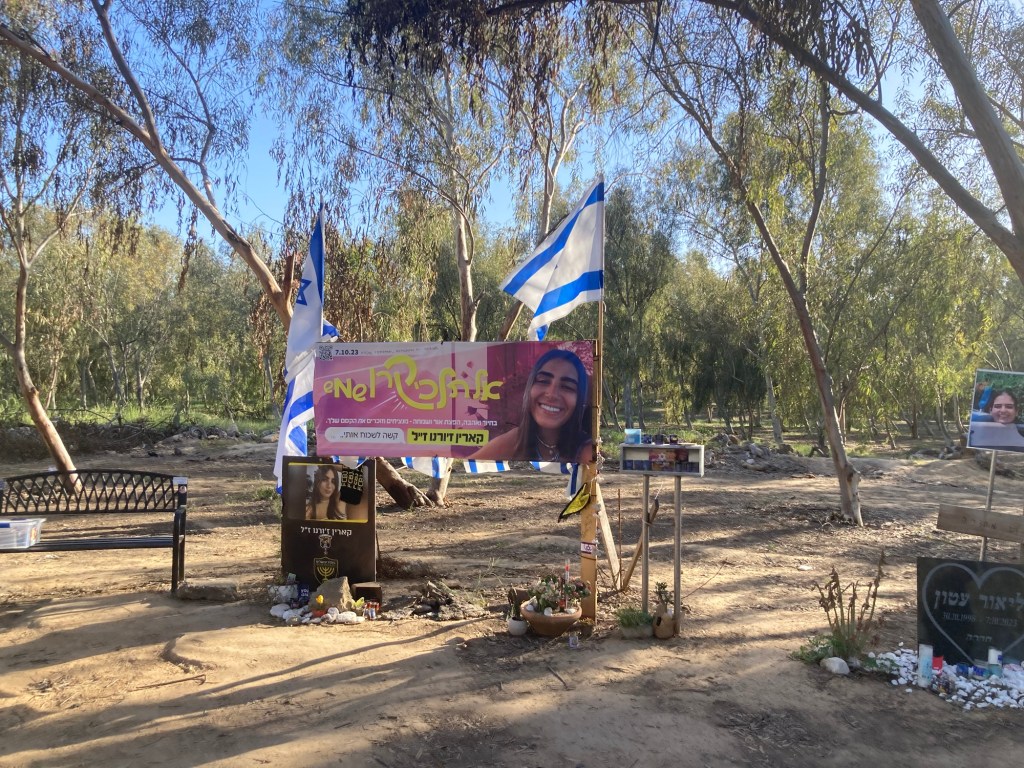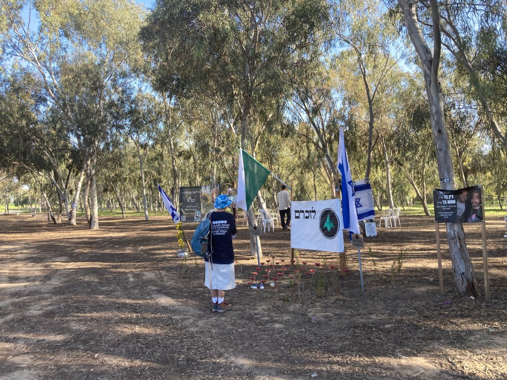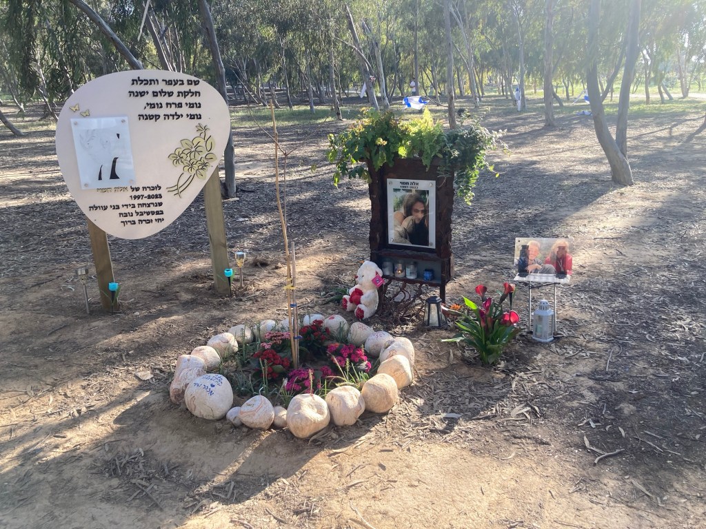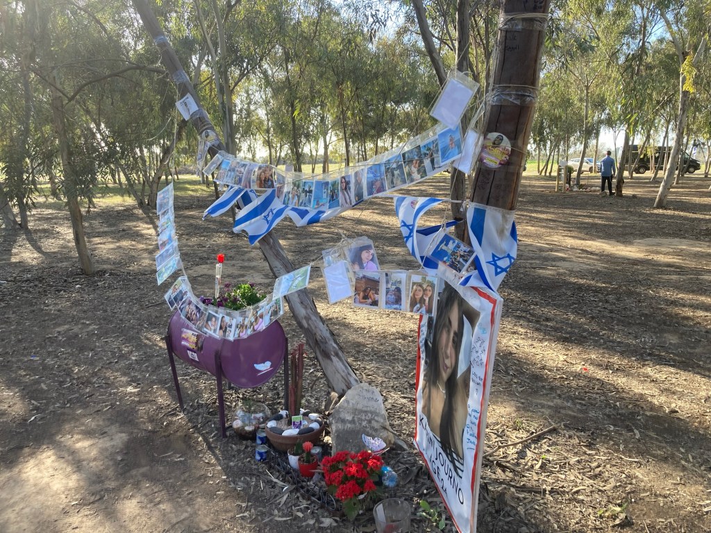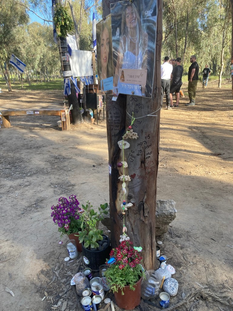 Further off in the distance was the place where vendors, food trucks and picnic tables were set up. Now families have marked with Israeli flags and makeshift memorials, the exact place where their loved ones lay slain. Candles, posters, photographs, letters, jewelry, lanterns are all decorations of lives lived fully. Trees under where the body lay are marked with farewells. It’s beyond sad.
