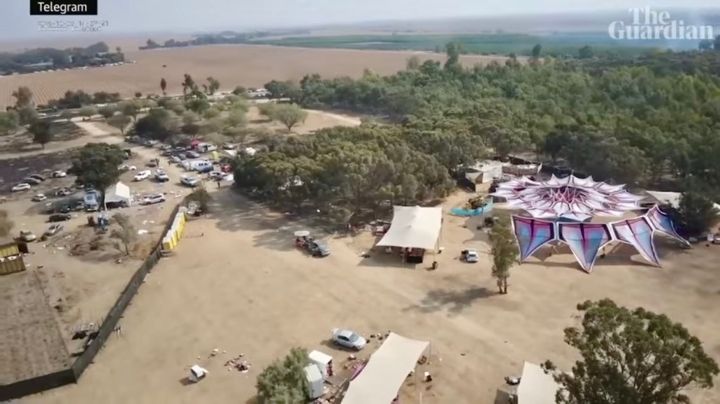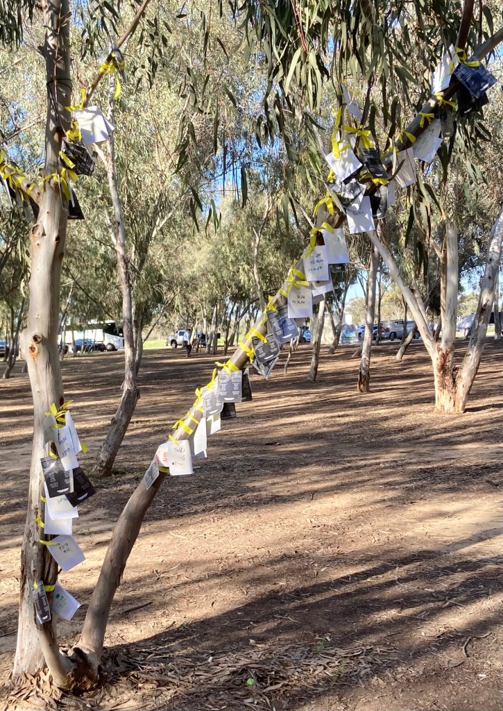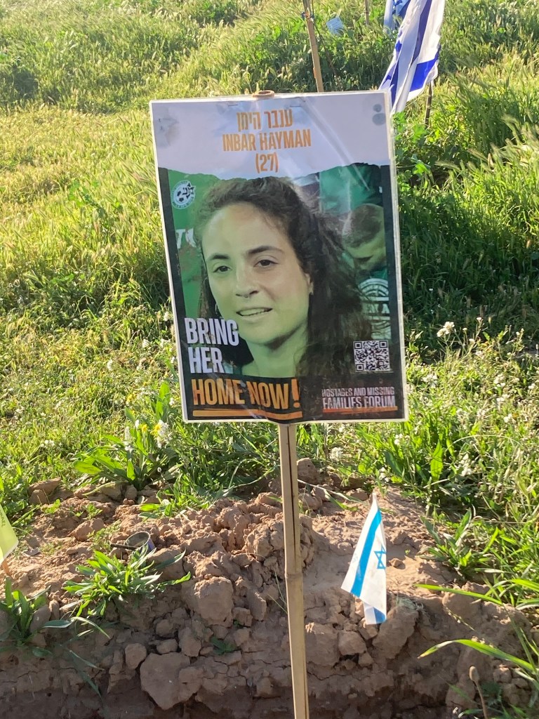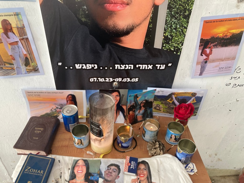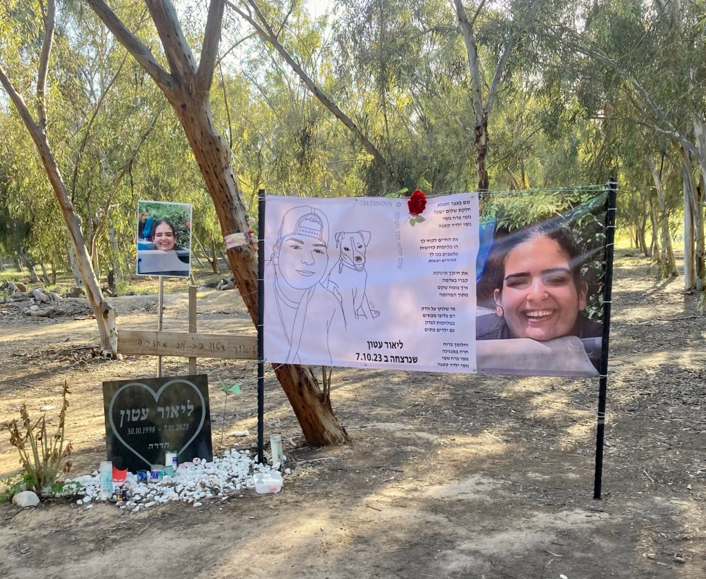 Further off in the distance was the place where vendors, food trucks and picnic tables were set up. Now families have marked with Israeli flags and makeshift memorials, the exact place where their loved ones lay slain. Candles, posters, photographs, letters, jewelry, lanterns are all decorations of lives lived fully. Trees under where the body lay are marked with farewells. It’s beyond sad.
