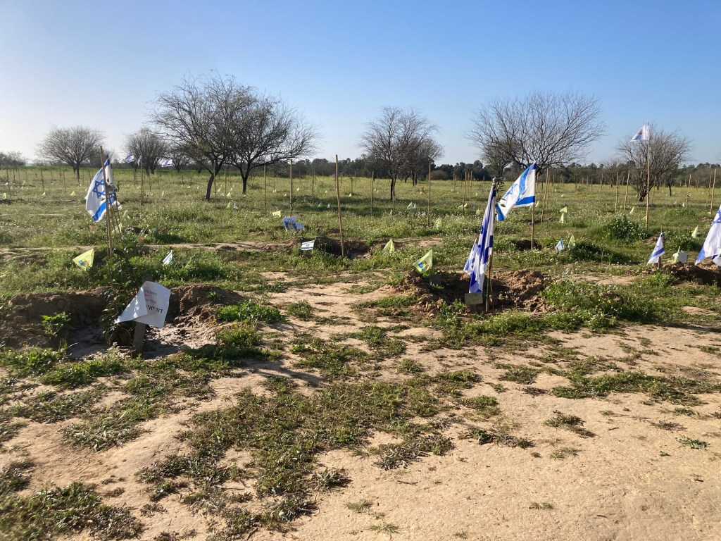 At the exit, we took a right onto route 232. There, on 7 October, cars that were escaping the shooting terrorists were told by soldiers to go left. Only they weren’t IDF soldiers. Hamas had stolen military uniforms to look official. It was a trap. Scores of people crossed the road, ran into the fields and were picked off like shooting at ducks. Now the fields are full of wildflowers. It is nature’s tribute to those slain.