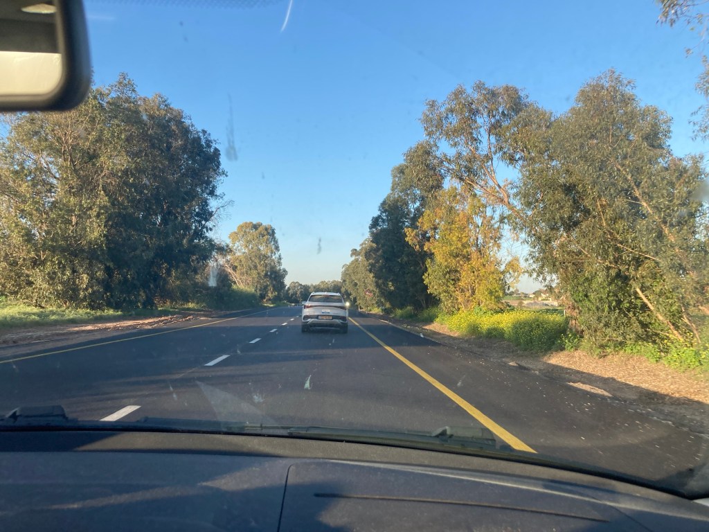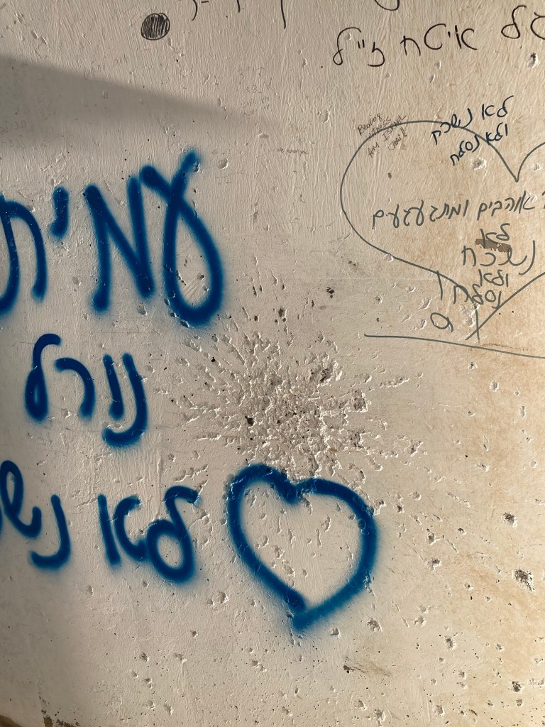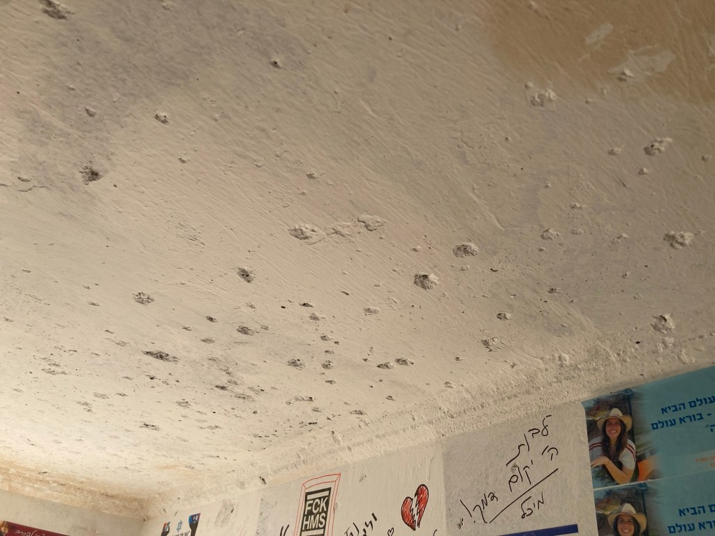 We passed through Ofakim (where Rachel held four terrorists at bay while serving them lunch, cookies and coffee). This small city seemed busy with people on the streets going about their business and everything open. Except for random bullet holes in signs and at bus stops, you’d never know this whole city was crawling with Hamas and civilians from Gaza bent on killing and raping and kidnapping.