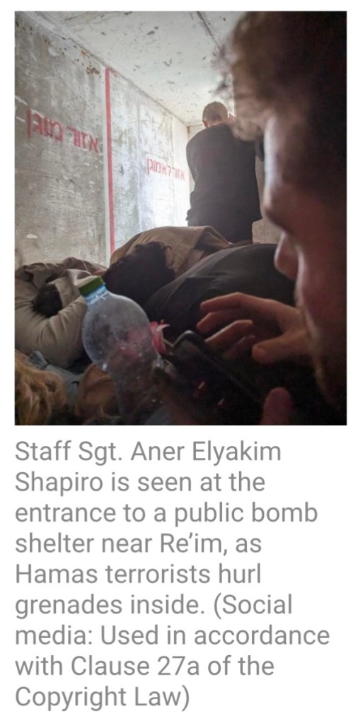 In a remarkable feat of heroism, British Israeli soldier, Aner Eliakim Shapiro, age 22, lobbed seven grenades out of the shelter. They were thrown in by Hamas assassins in attempts to kill the kids trapped inside. Some had been shot beforehand. The eighth grenade killed Aner, but his actions saved several people who were rescued later that night by IDF.