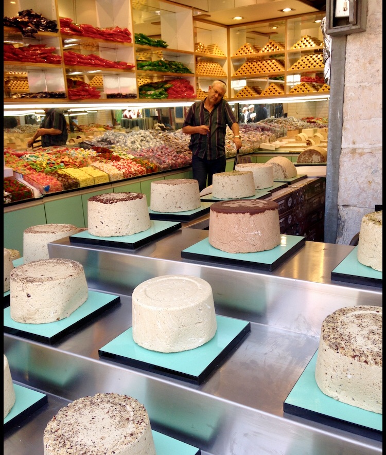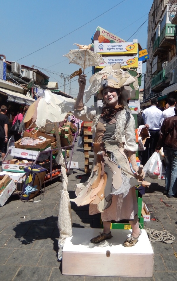 After breakfast, we went to Machaneh Yehuda Market, an entire covered square block of vendors and stalls selling produce, fish, meats, candy, baked goods, fresh squeezed juices, teas, spices, flowers, eggs, cheese, halvah, nuts, sweets, herbs, coffees, and everything else edible, gourmet and mundane. I did my shopping for the week, getting fresh figs!!!!! among other great things. (At night the stalls close up and the nightclubs and restaurants take their place… it becomes quite the hopping place for the younger crowd). But this morning, there were the usual rabbis, old ladies and beggars asking for spare change to feed the hungry; the guys playing guitar and hand drum and the Rastafarian dude with the steel marimba and the mime. The beautiful mime with her handmade outfit and props. She was standing there at one of the entrance on her little box platform, with her bird in its cage. Just standing, parasol in hand. Just standing.