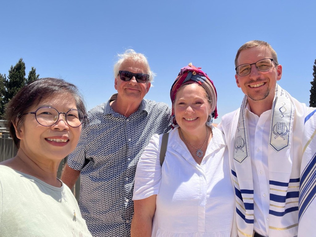 Shavuot marks the birth and the death of King David. I did not realize this. So we went to David’s tomb, which was pretty packed. The Upper Room where Jesus celebrated the Last Supper is located in the same building just above David. I also had not realized this. It was locked, but the roof access was open, so we went up there to pray and to chat. There were a few people already up there, including a group from Hong Kong, of all places. So a lady we spoke with was kind enough to take a photo of us.
