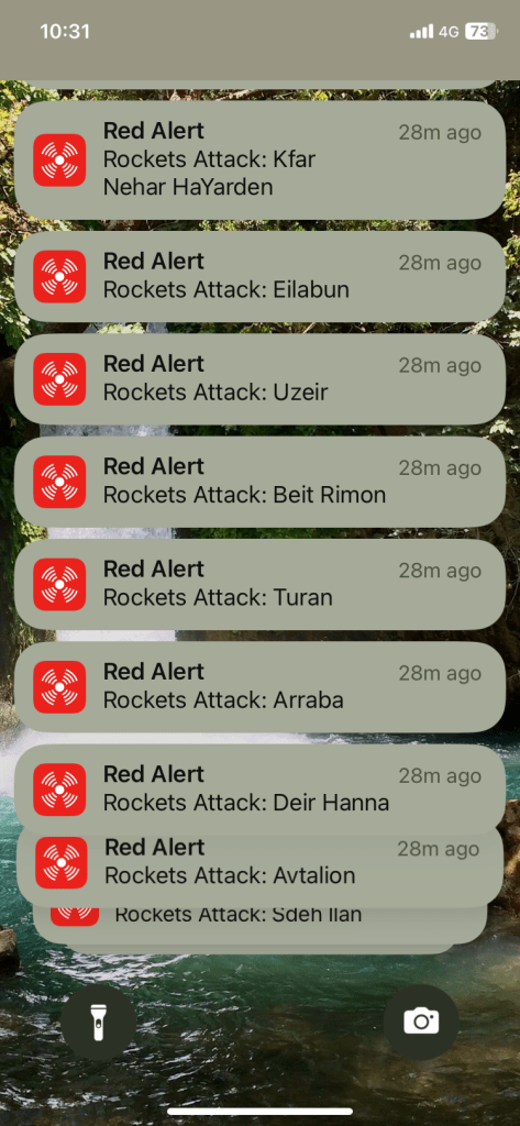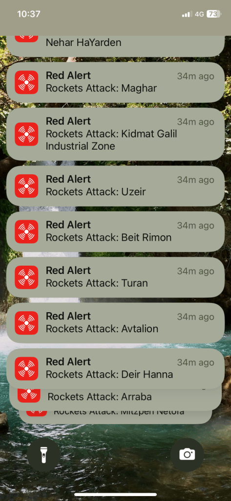 I’ve learned to time my comings and goings to the latest local news. It seems Hizbulla sends over armed drones and rockets in the early morning, noon, around three in the afternoon, at sunset and later at night. They have a limited reach, which has never directly affected us. When the IDF targets and kills a high level IRGC or Hizbulla official or commander, the intense drone and missile strikes are launched. This is the time we know to stay close to home just in case. Last week there were two of these volleys of 40-60 missiles targeting the Galilee and the Golan. The drones are difficult to intercept because they are mostly plastic and fly quite low avoiding detection. These military grade drones supplied by Iran can carry 88 pounds of explosives and can travel at speeds of upwards of 360 mph.
