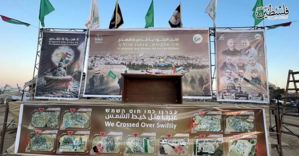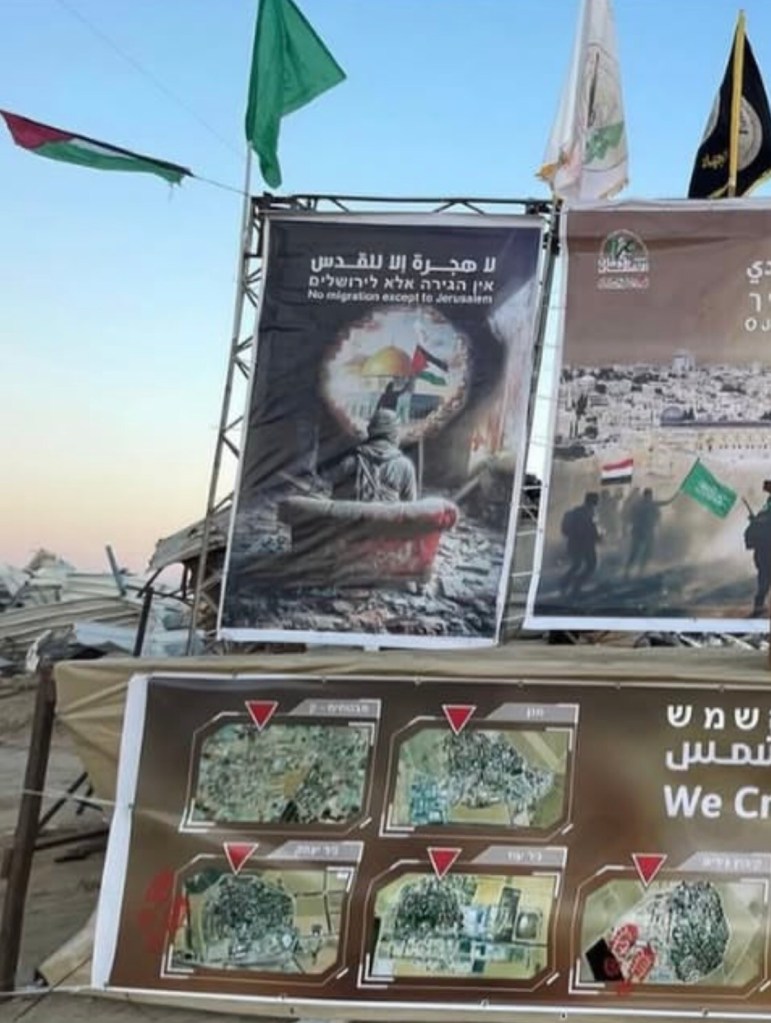 The poster at the bottom that stretches along the length of the platform shows photographs of Israeli army bases and Israeli villages and kibbutzim. The words read, “We crossed over swiftly.” It tells Israel that Hamas have done it once, and will do it again. There is no regret, only pride. The photoshopped canvas that hangs to the right shows all the past (martyred) and present leaders of Hamas. It is to give inspiration to the Palestinians. At the bottom is a picture of the Old City of Jerusalem…which they indicate will be conquered.