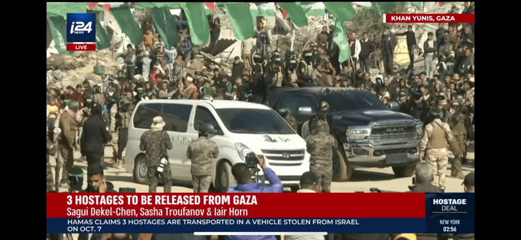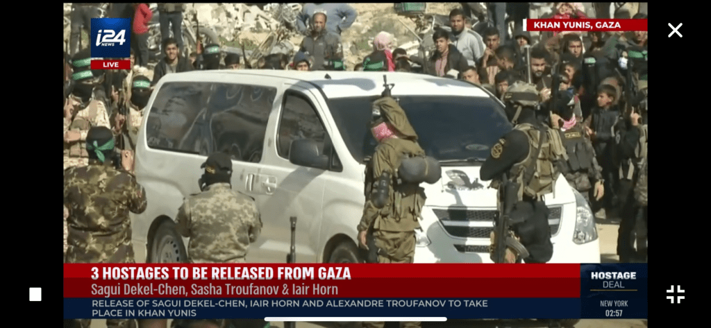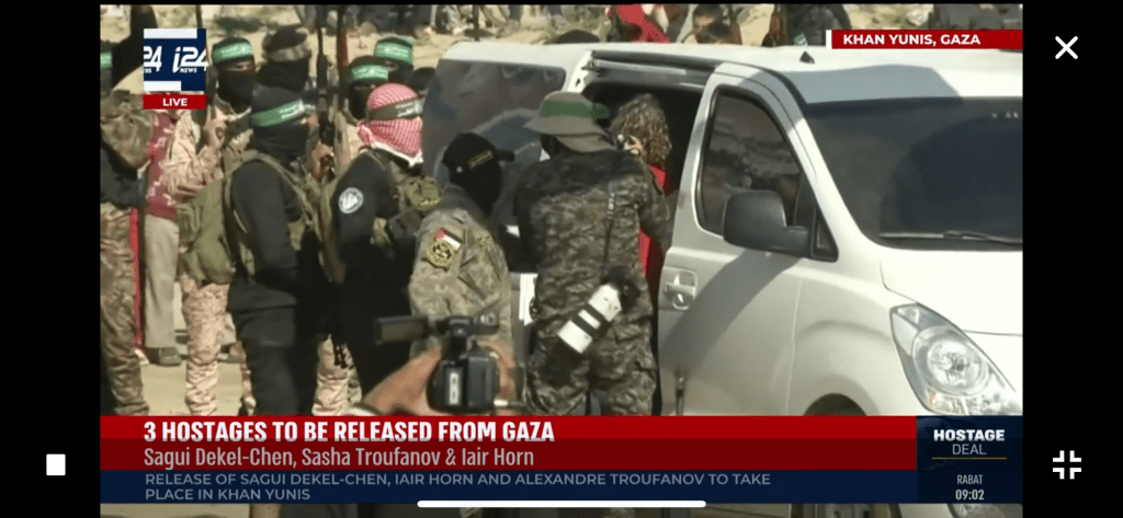 Three Israeli captives, Yair Horn Sasha Troufanov (a Russian Israeli), and Sagi Dekel-Chen (American Israeli), were paraded onto the stage with their certificates and goodie bags. I was watching on AlJazeera news live, Memri TV, and i24news to see all sides. The reporters (only Muslim) were present with their expensive cameras and recording equipment. All “journalists” wore the military terror uniforms. The hostages were made to thank their captors for their excellent treatment.