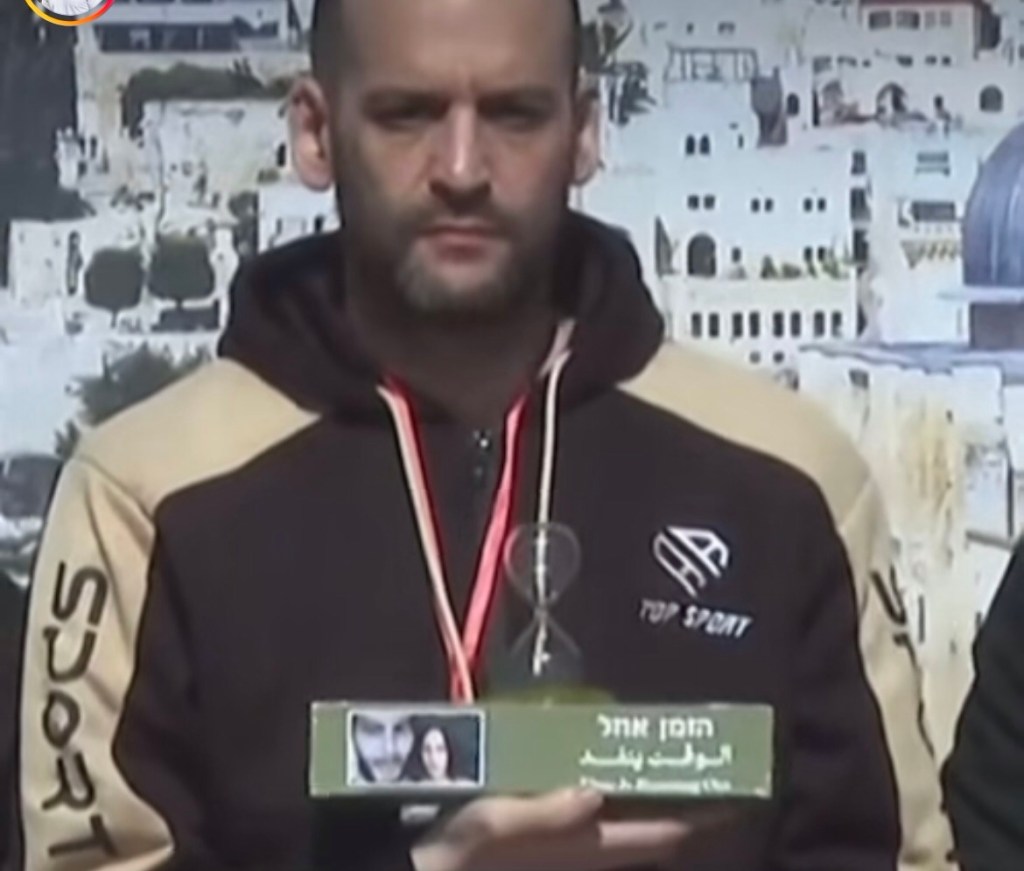 Again, the stage was decorated symbolically. Several flags are on display: the Palestinian, Hamas, PIJ, Daesh (ISIS) and other brigade flags I did not recognize. To the left of the dais, the newly designed canvas poster showed a picture of Yahya Sinwar sitting in his bombed-out house where he was killed, on his red sofa, looking out over the Dome of the Rock on the Temple Mount. There is a conquering Palestinian flag over the Temple Mount. The writing in Arabic, English and Hebrew reads “No immigration except to Jerusalem.” That means they will not stop fighting until Jerusalem and all Israel is conquered.