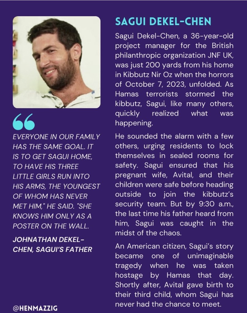 We are all overjoyed at their homecoming. Still, Sasha today learned that his father was murdered on Oct. 7. His grandmother, mother and girlfriend were also kidnapped, and he was shot in both legs while taken hostage. He returned limping. Yair was taken along with his brother, Eitan, into Gaza. Only Yair was released, and if you watch the video, not only was he limping, but escorted by the arms and holding on to nearby objects to balance. His brother was left nehind, not even one of the names included for this Phase 1 hostage release cycle. Sagi was captured before his daughter was born and missed the first year of her life. Today his wife told him, she named their baby Shachar Mazal…Dawn of Mazal (fortune). All of their homes on the Nir Oz kibbutz were completely bombed and burned out.