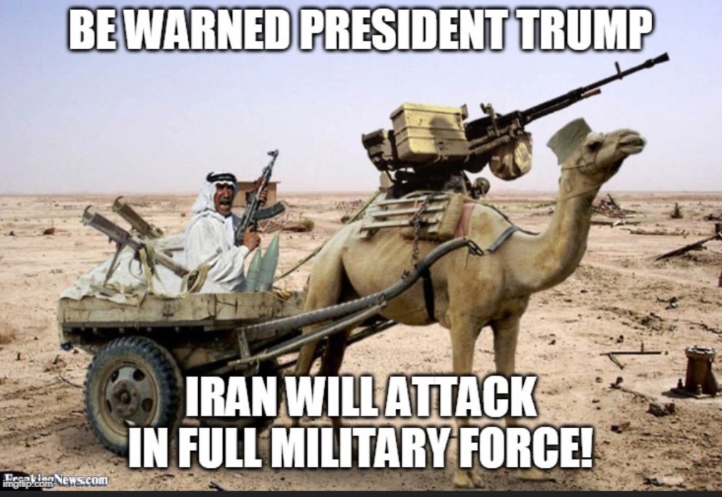 Khameni calls Trump and says, “I had a dream last night that all of New York was in ruins, and Iranian flags were flying everywhere.” Trump replies, “Strange. I dreamed that all of Tehran was thriving, full of high tech and billboards…”. “What did the billboards say?” asks Khameni. Trump answers, “You think I know how to read Hebrew?”