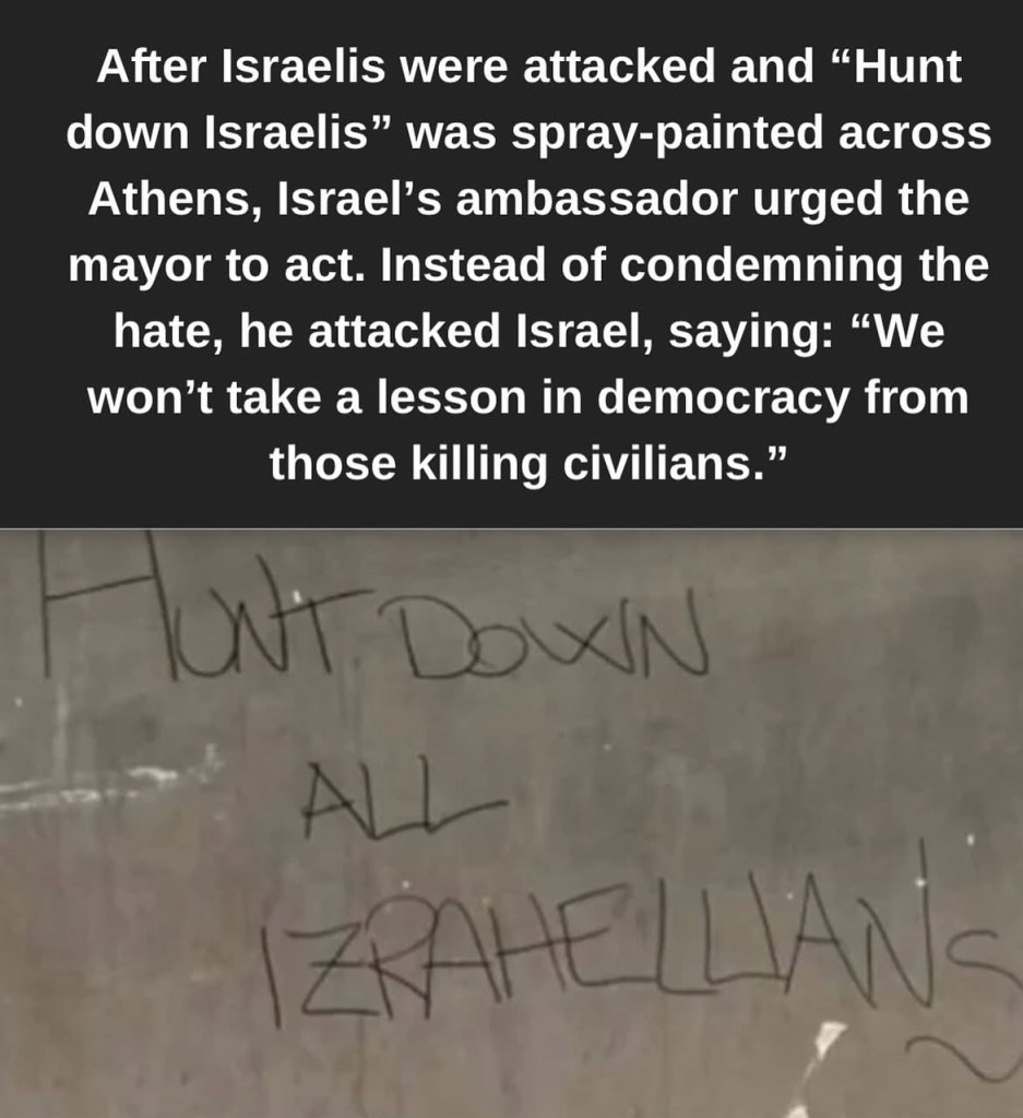 My son was going to take his girlfriend to Athens in two weeks to propose to her. They have, thankfully, cancelled that trip. You see, in just the past weeks Israeli families have been forced out of their hotels for being Israeli. Young Jewish men wearing kippas (yarmulkes) have been severely beaten. Greece is no longer a safe vacation spot for Israelis or Jews. In several countries, soldiers who served in the IDF are being doxxed and ejected. A couple of former soldiers on vacation have been arrested for war crimes and crimes against humanity in Greece, Brazil and Malaysia.